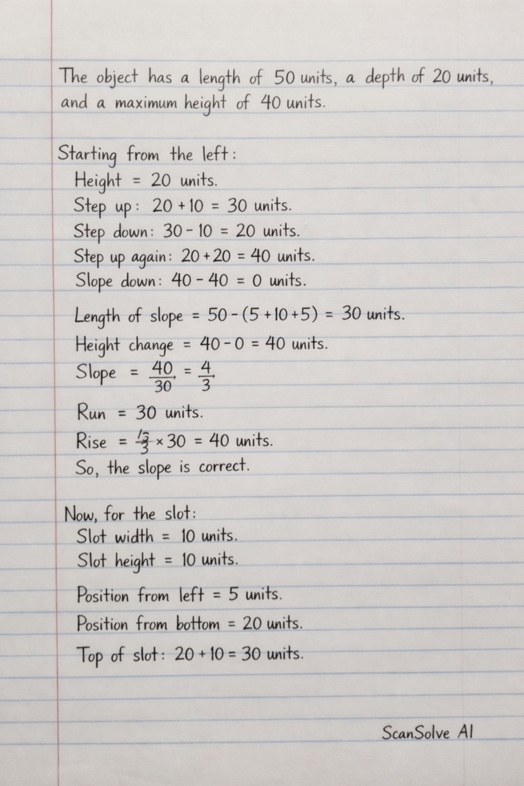 The assembled figure is a solid object with a length of 50 units, a depth of 20 units, and a maximum height of 40 units. Its front profile features a stepped top surface: starting from the left at a height of 20 units, it steps up to 30 units, then down to 20 units, then up to 40 units, before sloping linearly down to the bottom-right corner. A rectangular slot, 10 units wide and 10