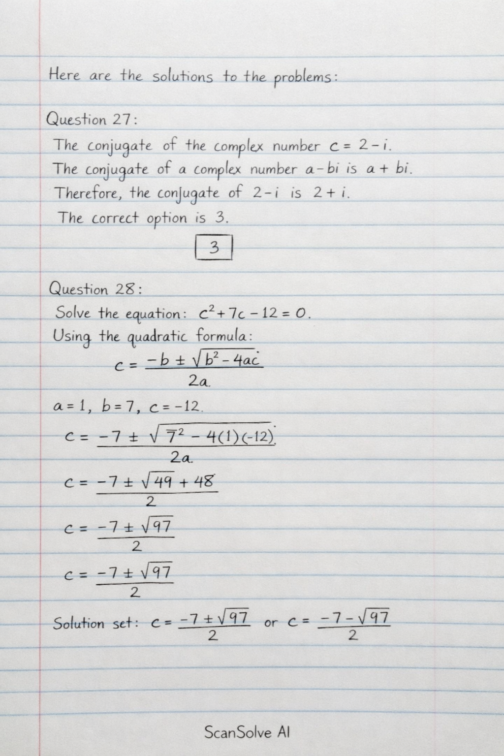 Question 27: The question asks for the conjugate of the complex number . The conjugate of a complex number is . Therefore, the conjugate of is .