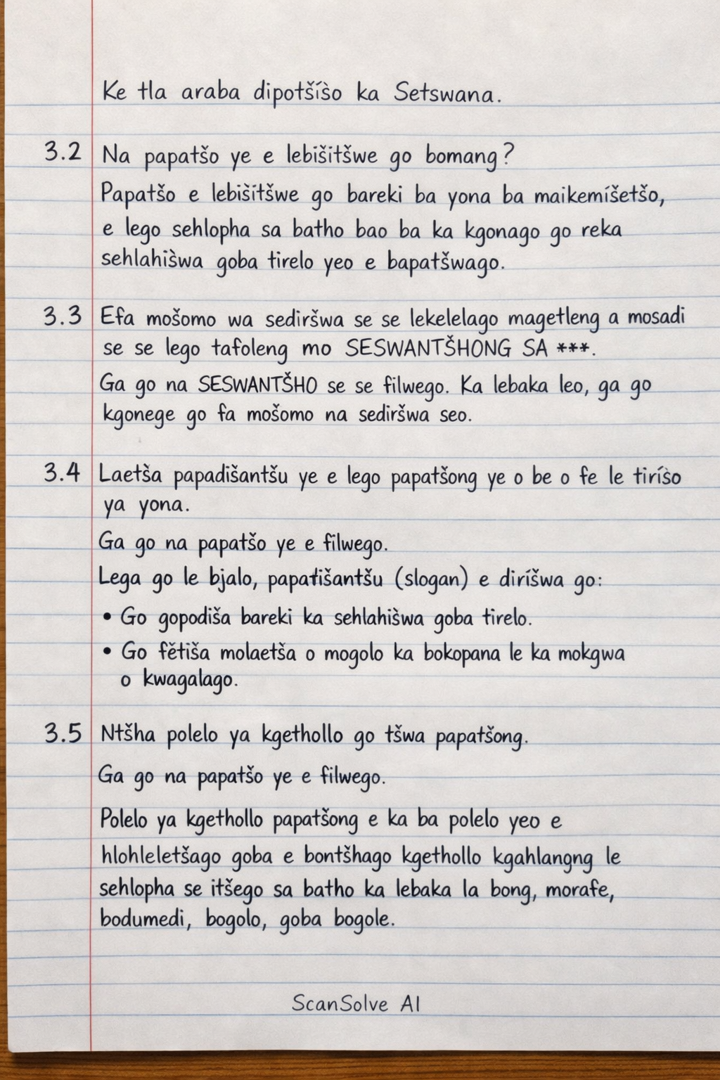 3.4 Laetša papadišantšu ye e lego papatšong ye o be o fe le tiriso ya yona Ga go na papatšo ye e filwego. Lega go le bjalo, papadišantšu (slogan) e dirišwa go: • Go gopodiša bareki ka sehlahiswa goba tirelo. • Go fetiša molaetša o mogolo ka bokopana le ka mokgwa o kwagalago.