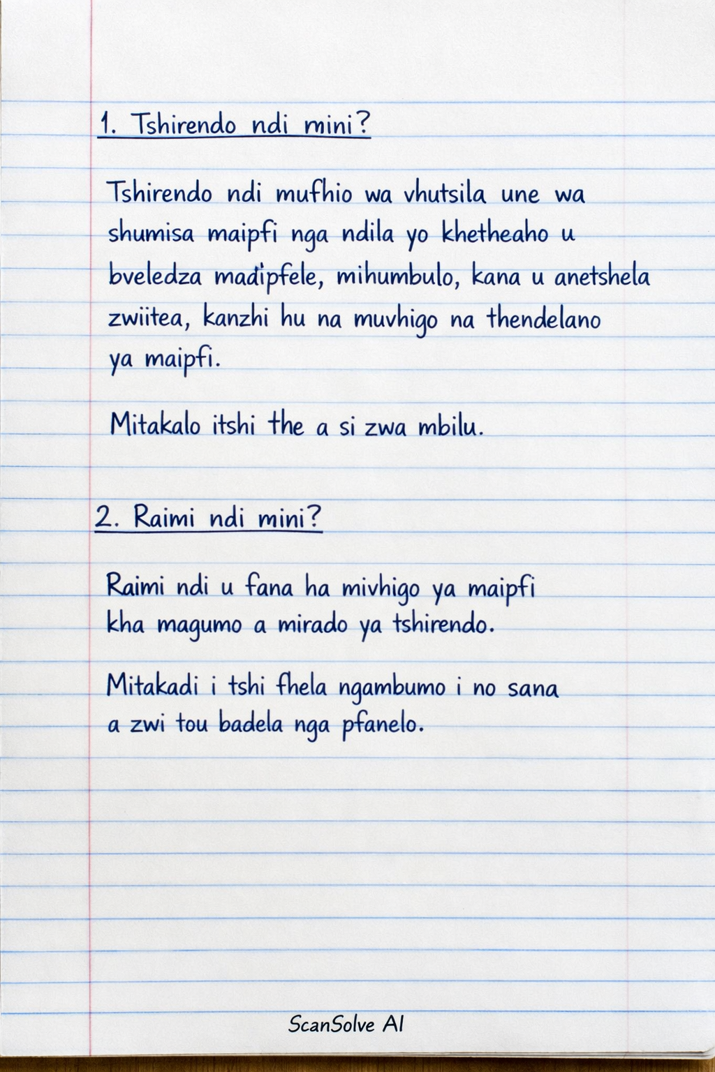 Raimi ndi mini? (What is rhyme?) Raimi ndi u fana ha mivhigo ya maipfi kha magumo a mirado ya tshirendo. (Rhyme is the similarity of sounds of words at the end of lines of a poem.) Your answer "mitakadi i tshi fhela ngambumo i no sana" is partially correct in concept but uses an incorrect term ("mitakadi").