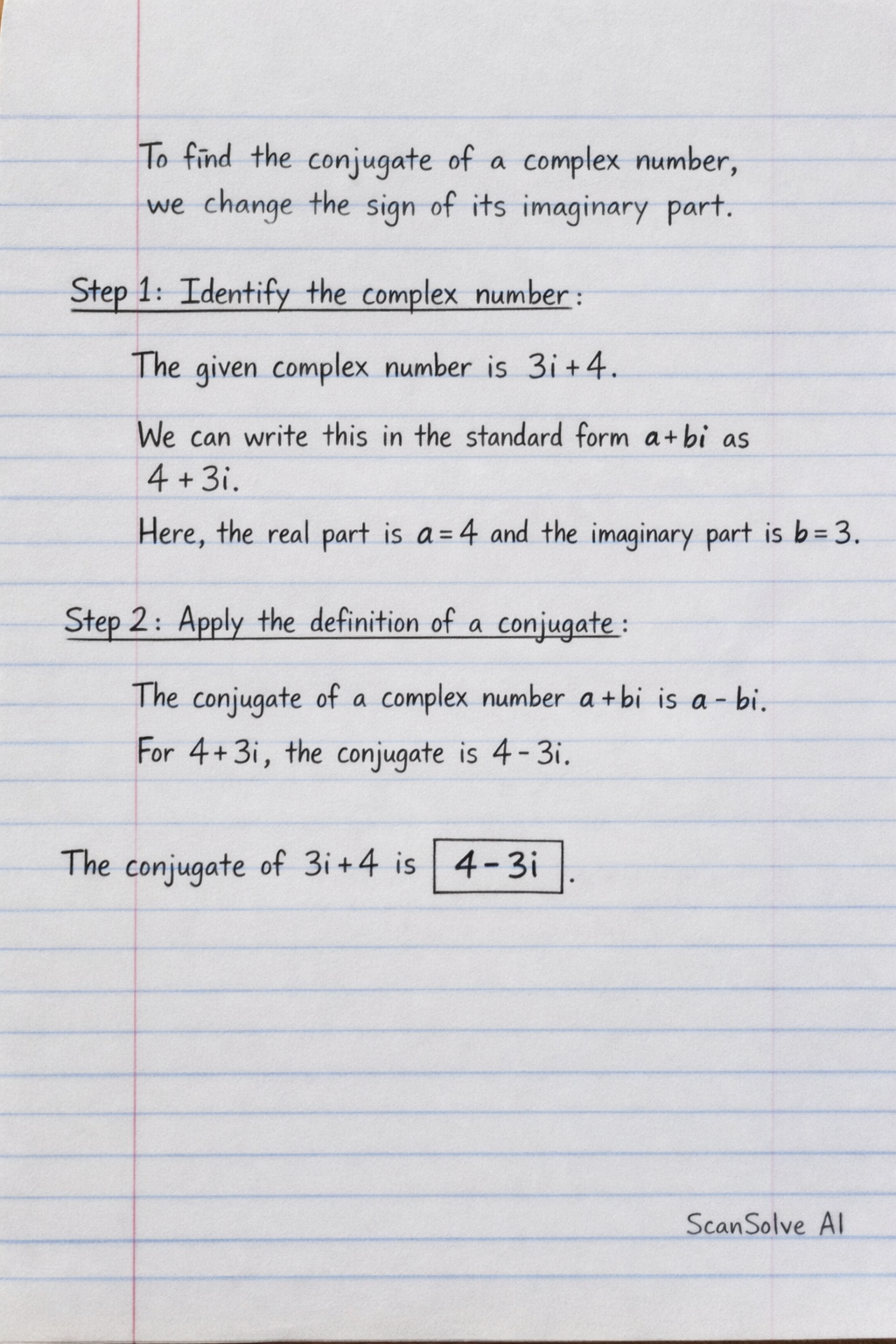 What is the conjugate of 3i+4 ?