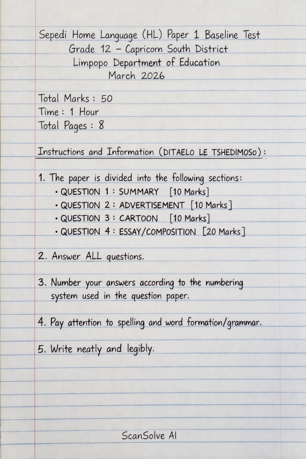 This document is a Sepedi Home Language (HL) Paper 1 Baseline Test for Grade 12 students from the Capricorn South District in Limpopo Department of Education, dated March 2026.