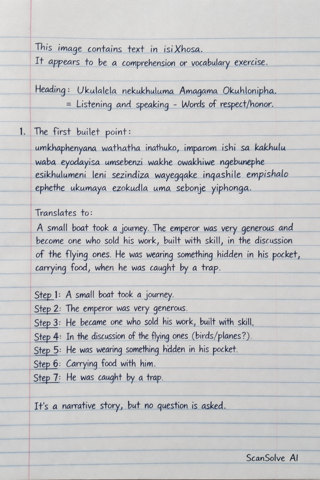 This image contains text in isiXhosa. It appears to be a comprehension or vocabulary exercise.