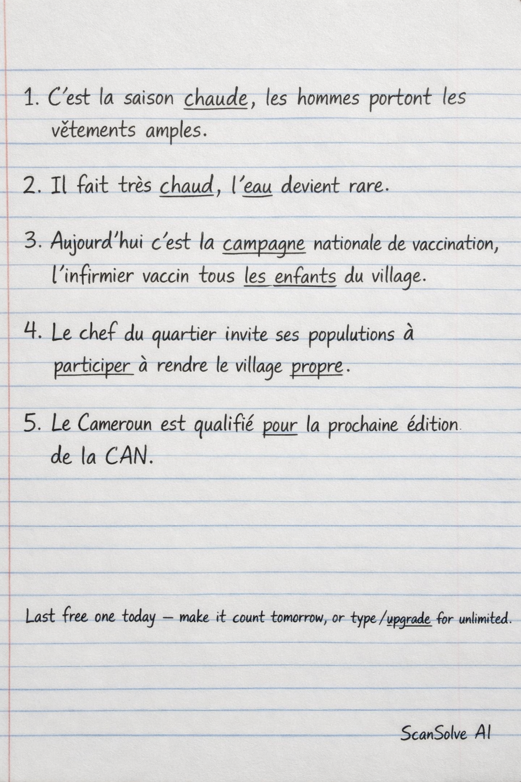 1- C'est la saison chaude, les hommes portent les vêtements amples. 2- Il fait très chaud, l'eau devient rare. 3- Aujourd'hui c'est la campagne nationale de vaccination, l'infirmier vaccin tous les enfants du village. 4- Le chef du quartier invite ses populations à participer à rendre le village propre. 5- Le Cameroun est qualifié pour la prochaine édition de la CAN.