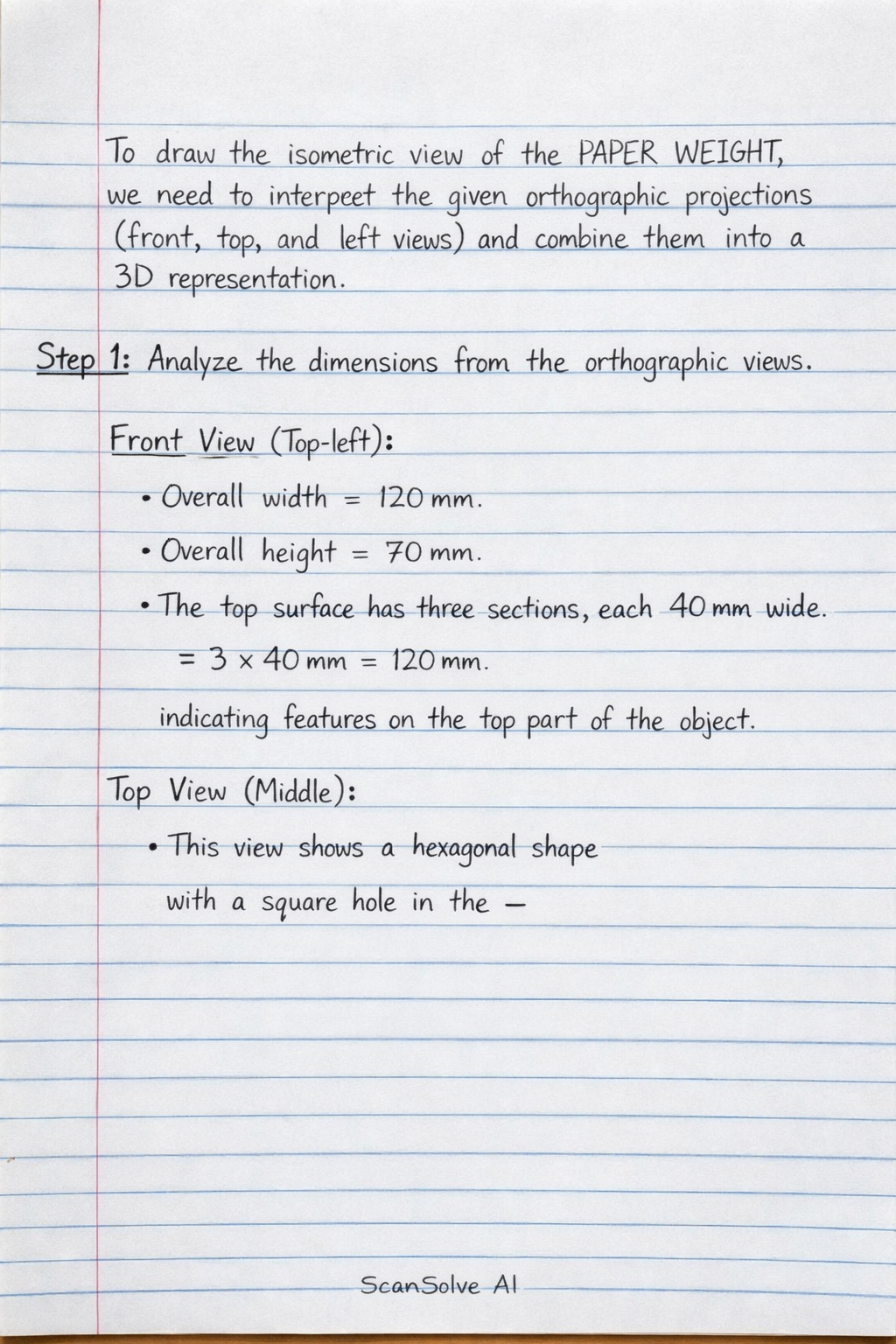 Step 1: Analyze the dimensions from the orthographic views.