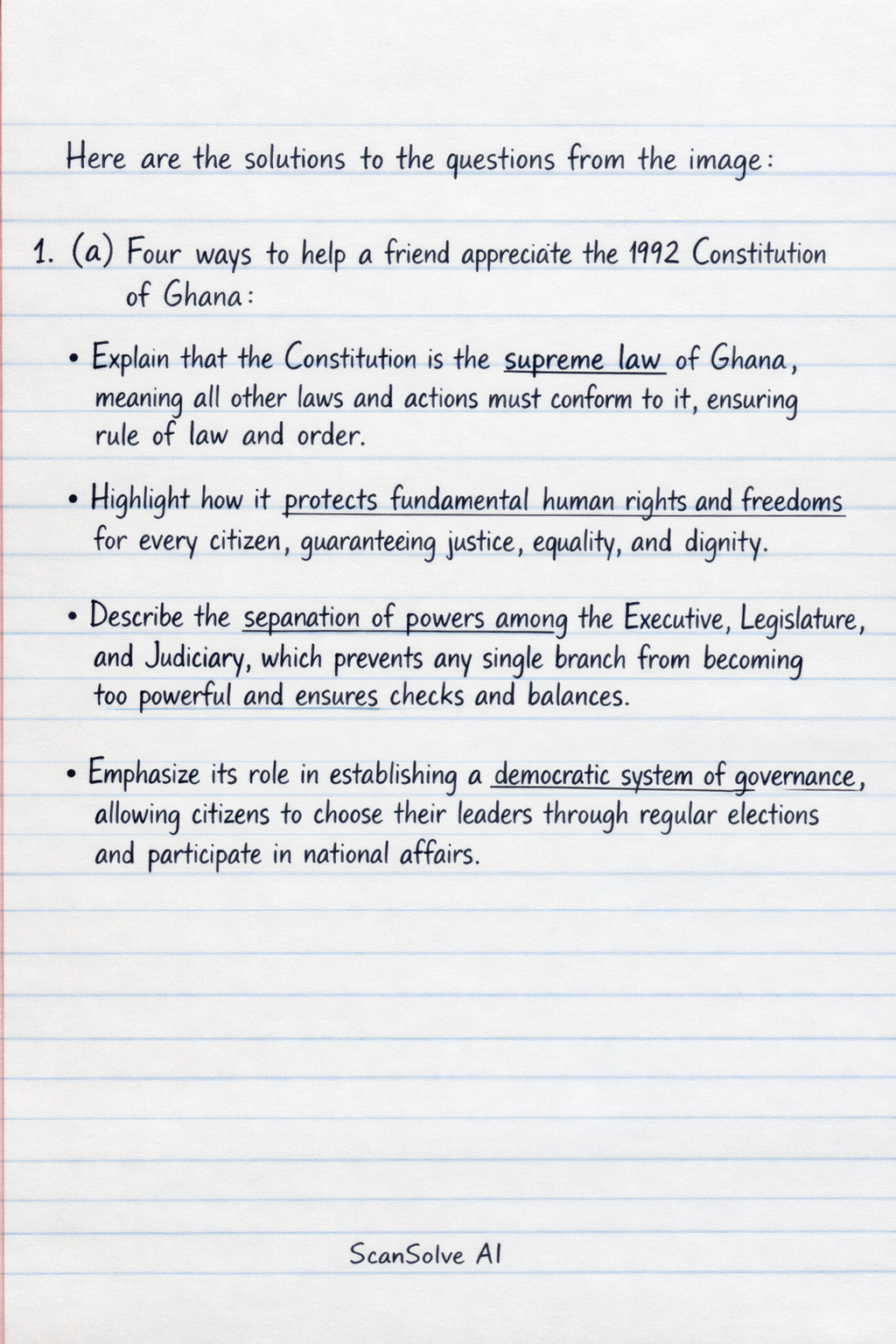 1. (a) Four ways to help a friend appreciate the 1992 Constitution of Ghana: • Explain that the Constitution is the supreme law of Ghana, meaning all other laws and actions must conform to it, ensuring rule of law and order. • Highlight how it protects fundamental human rights and freedoms for every citizen, guaranteeing justice, equality, and dignity. • Describe the separation of powers among the Executive, Legislature, and Judiciary, which prevents any single branch from becoming too powerful and ensures checks and balances. • Emphasize its role in establishing a democratic system of governance, allowing citizens to choose their leaders through regular elections and participate in national affairs.