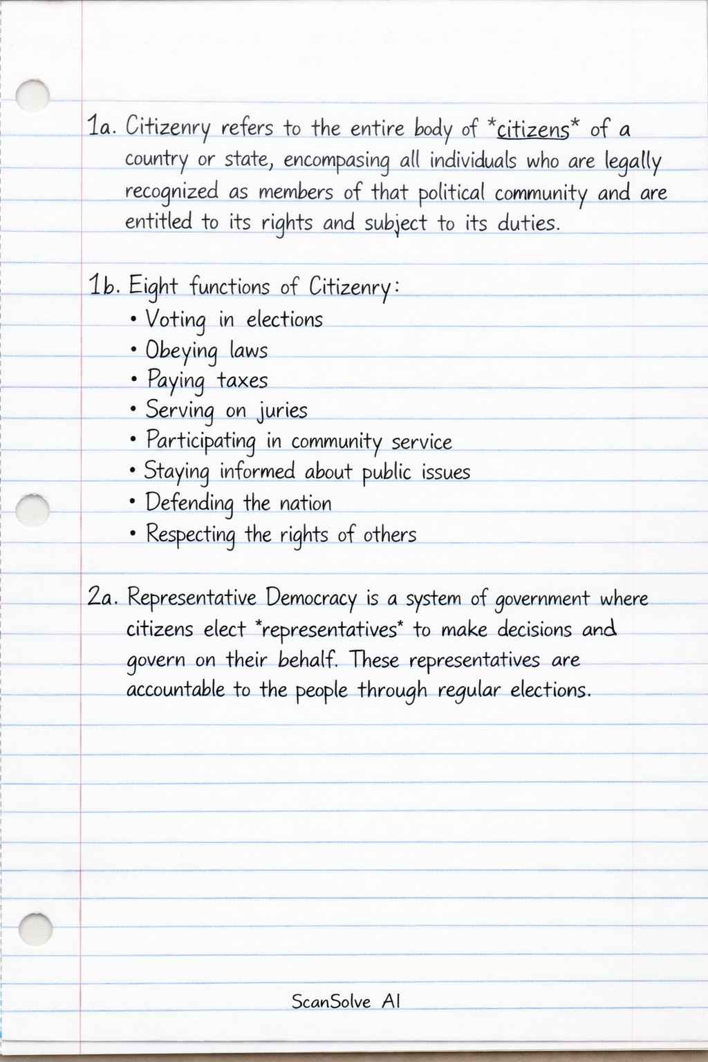 2a. Representative Democracy is a system of government where citizens elect representatives to make decisions and govern on their behalf. These representatives are accountable to the people through regular elections.