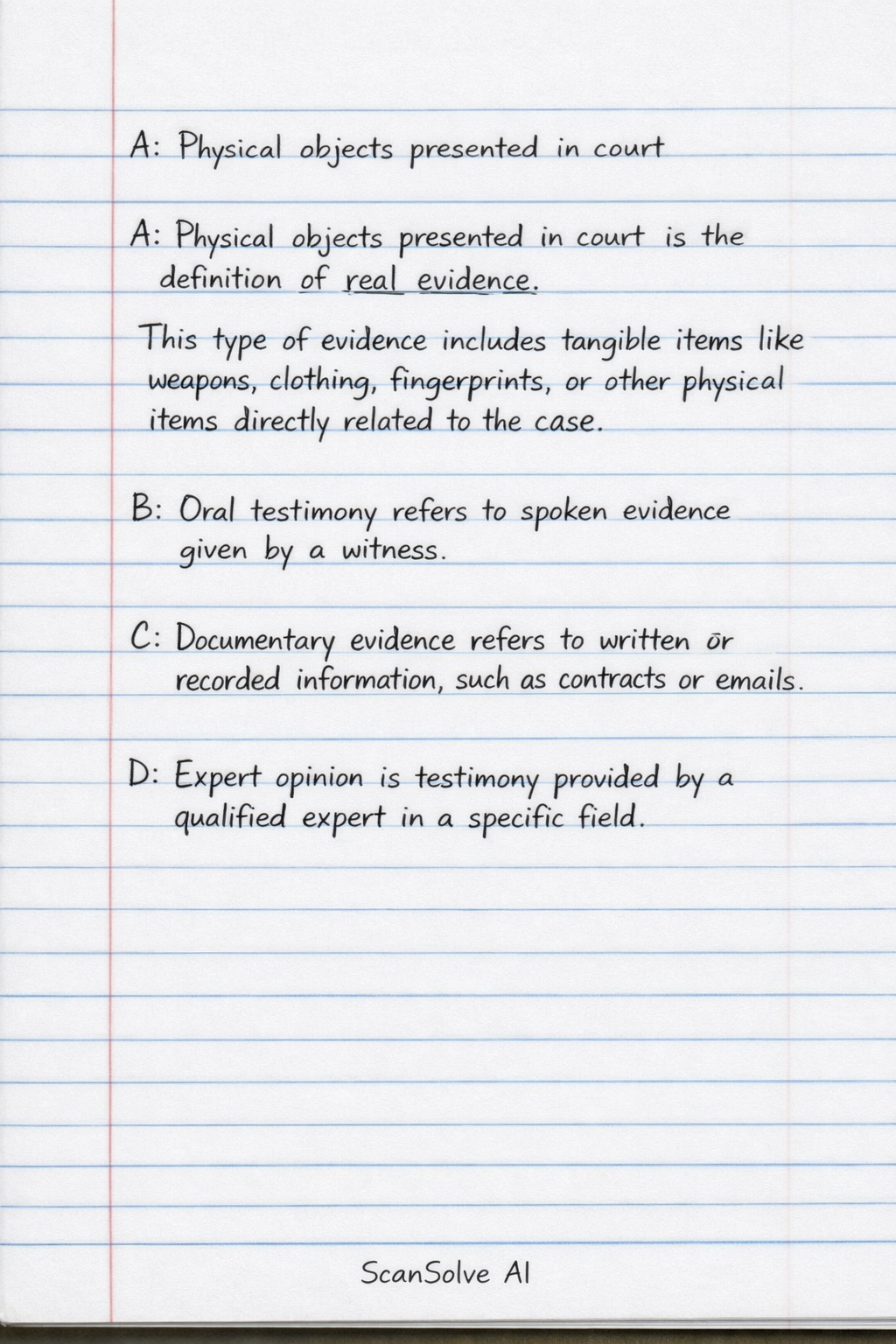 A: Physical objects presented in court is the definition of real evidence*. This type of evidence includes tangible items like weapons, clothing, fingerprints, or other physical items directly related to the case.