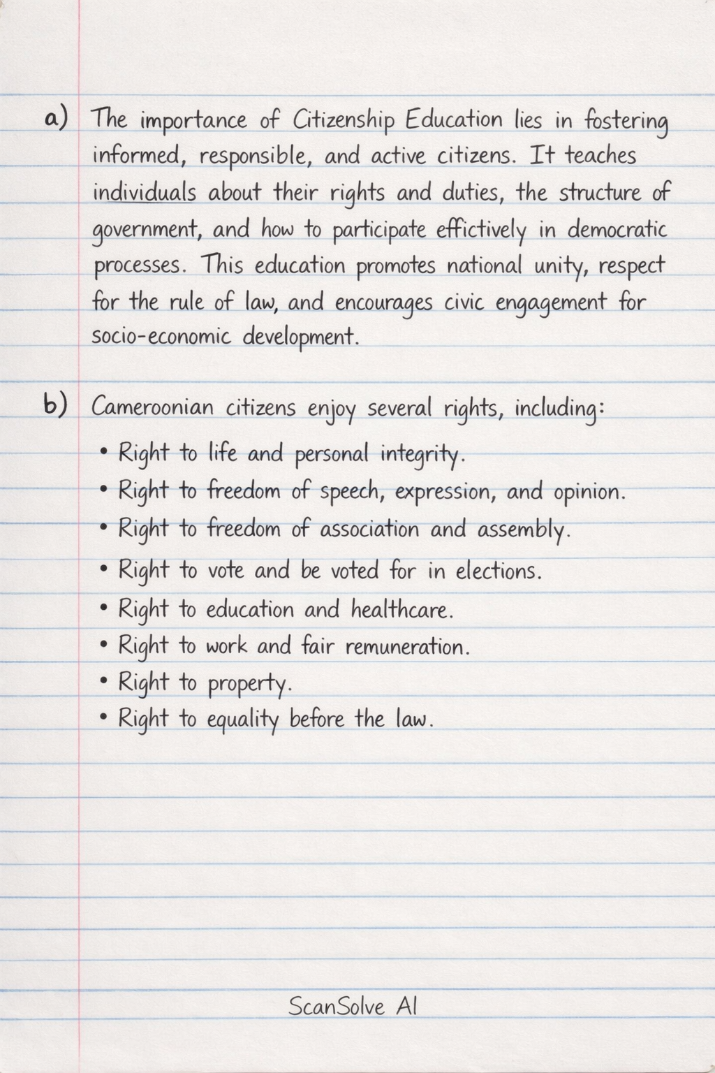 a) The importance of Citizenship Education lies in fostering informed, responsible, and active citizens. It teaches individuals about their rights and duties, the structure of government, and how to participate effectively in democratic processes. This education promotes national unity, respect for the rule of law, and encourages civic engagement for socio-economic development.