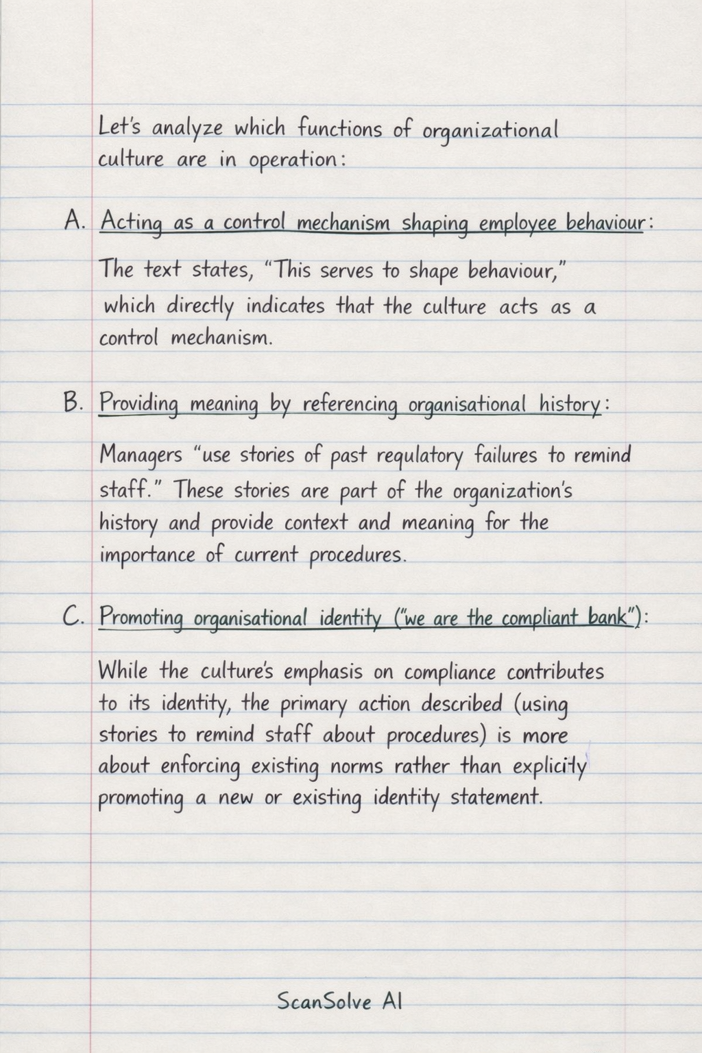 - C. Promoting organisational identity ("we are the compliant bank"): While the culture's emphasis on compliance contributes to its identity, the primary action described (using stories to remind staff about procedures) is more about enforcing existing norms rather than explicitly promoting a new or existing identity statement.