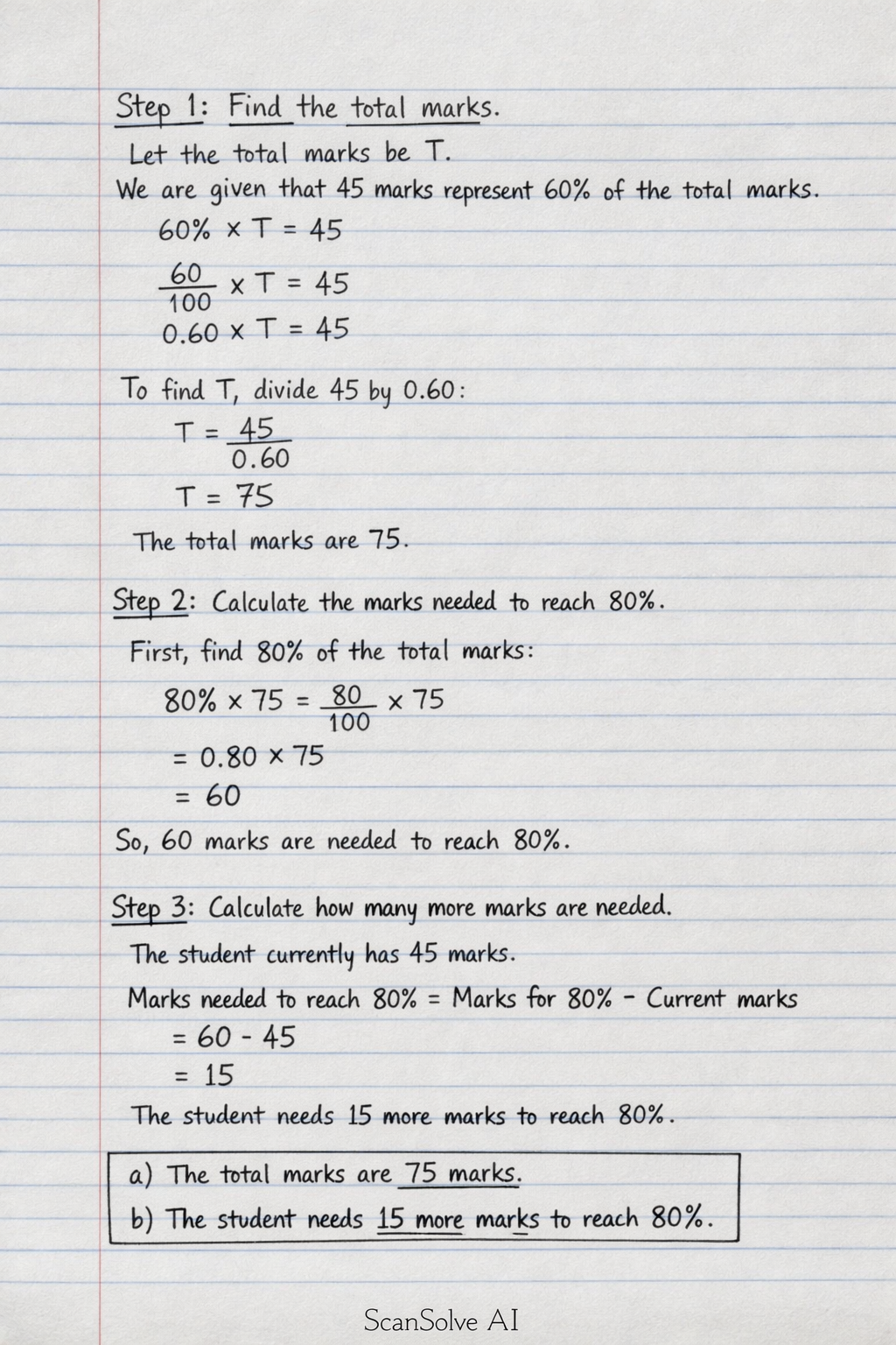 Skip to main content ScanSolve ScanSolve - AI Homework Helper 4.9★ (2.1M ratings) GET ScanSolve logo ScanSolve U Homework Tutor Humanizer AI Detector Questions Blog History Mobile App Account Quick Answer Here is the solution to Q1: Q1. A student scored 45 marks in a test which is 60%. a) Find the total marks b) How many more marks are needed to reach 80%? Step 1: Find the total marks. Let the total marks be T. Home / Law Homework Help / [4/12, 1:26 PM] +233 20 401 4109: BECE 2026 Integrated Scien… [4/12, 1:26 PM] +233 20 401 4109: BECE 2026 Integrated Science Section B Practice (For Candidates) INSTRUCTION Answer any THREE questions from this section. All questions carry equal marks. 🧪 Question 1: Machines & Energy a) i. What is a simple machine? ii. State two examples of simple machines. b) i. Differentiate between potential energy and kinetic energy. ii. Give one example of each. c) Explain two ways by which friction is useful in everyday life. 🌱 Question 2: Human Biology & Health a) i. What is digestion? ii. Name two organs involved in digestion. b) State three functions of nutrients in the human body. c) i. What is a deficiency disease? ii. Name one deficiency disease and its cause. ⚡ Question 3: Electricity & Forces a) i. What is electric current? ii. State the unit of electric current. b) A resistor of 50 Ω has a potential difference of 200 V across it. Calculate the current flowing through it. c) State two safety precautions when using electricity at home. 🌍 Question 4: Environment & Ecosystem a) i. What is an ecosystem? ii. State two components of an ecosystem. b) Draw and label a simple food chain using: Grass, Goat, Human, Sun c) State three human activities that destroy the environment and explain one. 🧬 Question 5: Matter & Chemistry a) i. Define an atom. ii. Name the three subatomic particles. b) Differentiate between: Physical change Chemical change c) State two properties of acids and two uses of acids. Question 6: Water & Air a) i. What is water pollution? ii. State two causes of water pollution. b) State three methods of conserving water bodies. c) Explain two importance of air to living organisms. [4/12, 1:26 PM] +233 20 401 4109: GHANA BECE 2026 🇬🇭🇬🇭| ENGLISH TRY THEORY QUESTIONS 1. A new curriculum has been introduced for Junior High Schools, but your school offers only a limited number of subjects. Write a letter to your headteacher suggesting two new subjects that should be taught in your school. Give two reasons for your choices. 2. Write a story to illustrate the saying: "A friend in need is a friend indeed." 3. You once doubted your abilities, but an experience changed your mindset completely. Write your story, ending with the statement, “I will never compare myself with anyone again.” [4/12, 1:26 PM] +233 20 401 4109: BECE 2026 MATHEMATICS HEAT QUESTIONS ✅ SOLVE Q1. A student scored 45 marks in a test which is 60%. a) Find the total marks b) How many more marks are needed to reach 80%? Q2. A sum of GH₵360 is shared among Kofi, Ama, and Yaw in the ratio 2 : 3 : 4. Find: a) Kofi’s share b) Ama’s share c) Yaw’s share Q3. A rectangular garden is 20 m long and 15 m wide. a) Find the perimeter b) Find the area c) Find the cost of fencing it at GH₵5 per metre Q4. Two angles on a straight line Find(x+10)°and (3x-20) ° a) Find x b) If one of the angles is part of a triangle, find the third angle if the other two are 50° and that angle. Q5. A shirt was sold for GH₵180 after a 10% discount. What was the original price? b) A shopkeeper bought goods for GH₵450 and sold them for GH₵540. Find the profit percentage. Q6. The marks of 12 students are: 42, 55, 50, 48, 55, 62, 38, 50, 55, 60, 45, 48 i. Find the mode ii. Find the range b) A bag contains 4 red, 3 blue and 3 green balls. One ball is drawn at random. Find the probability that it is: i. Blue ii. Not green Q7. a) A taxi company charges a fixed fee of GH₵10 plus GH₵1.20 per kilometer. How much will a passenger pay for a trip of 15 km? b) A rectangular field is 85 m long and 60 m wide. A farmer wants to put a fence around the field and also divide the field into 5 equal smaller plots by lines parallel to the shorter side. i. What is the perimeter of the field? ii. How many metres of fencing will be needed altogether? [4/12, 1:26 PM] +233 20 401 4109: BECE 2026 ICT Computing Section B Practice (For Candidates Answer Question 1 (compulsory) and any other THREE questions. Question 1 Compulsory General ICT Concepts. i. What is a computer system? ii. State two components of a computer system. b) i. Define information processing cycle. ii. List the four stages involved. c) State three functions of an operating system. d) Give two examples each of: Input devices Output devices Question 2 : Internet & Communication a) i. What is the internet? ii. State two uses of the internet. b) i. What is a web browser? ii. Give two examples. c) Explain the meaning of: i. URL ii. Search engine d) State two dangers of using the internet. Question 3: Storage & Memory a) Differentiate between: RAM ROM b) State three examples of storage devices. c) Explain two uses of a USB flash drive. d) What is backup and why is it important? Question 4: Word Processing & Application Software a) What is a word processor? b) State four features of a word processing application. c) Explain the difference between: Editing Formatting d) List two examples of word processing software. Question 5: Computer Hardware & Devices a) i. What is hardware? ii. State three types of hardware devices. b) Explain the function of: i. Keyboard ii. Mouse iii. Monitor c) What is a pointing device? Give two examples. Question 6 : Data & Information a) Differentiate between data and information. b) State three characteristics of good information. c) Explain two ways of storing data. d) State two uses of data in everyday life. Question 7: Flowchart & Problem Solving a) What is a flowchart? b) Draw and name three flowchart symbo