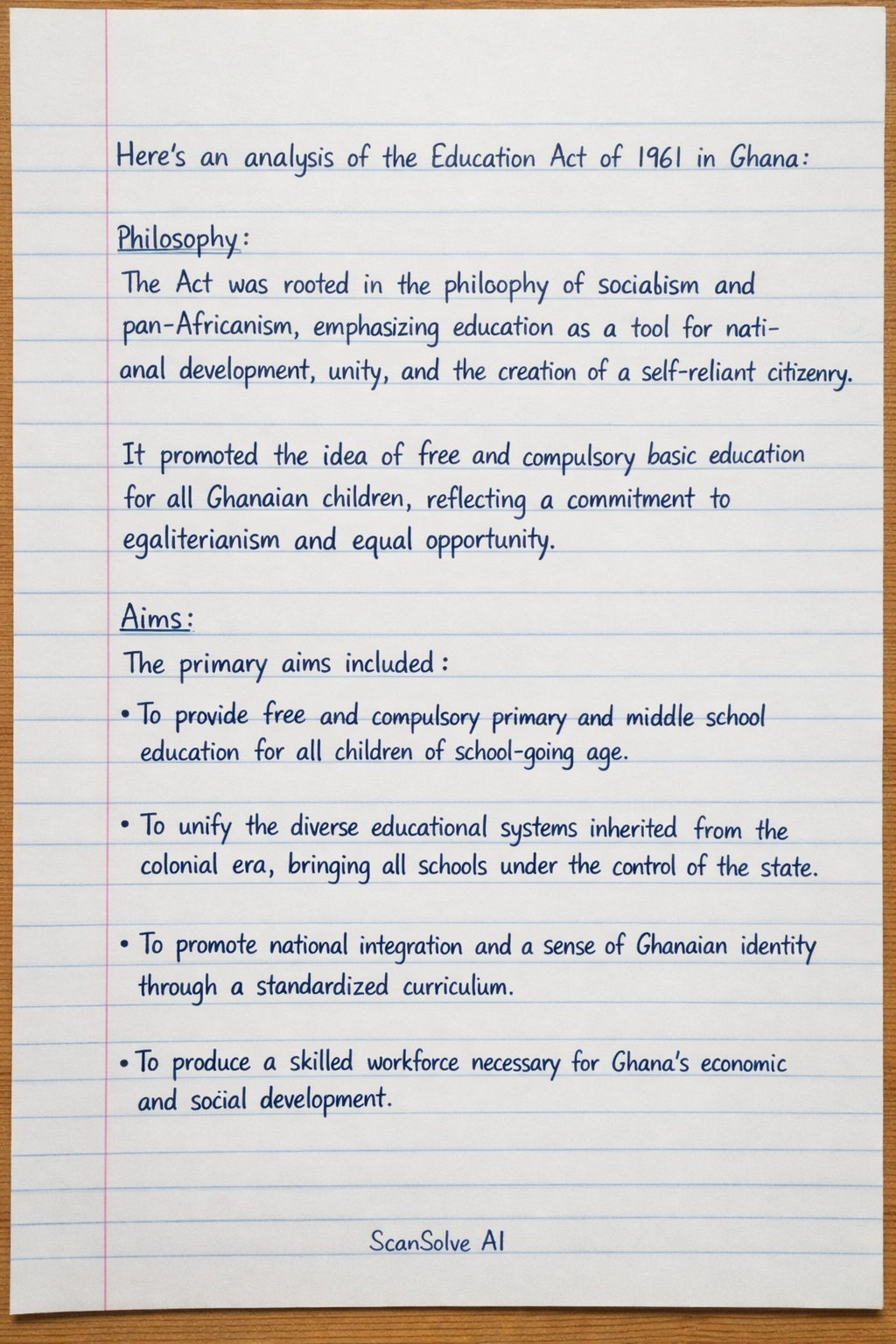 Rationale: The Act was deemed necessary to address the inequalities and fragmentation of the colonial education system, which largely favored urban areas and mission schools. It sought to correct the imbalance in access to education, reduce illiteracy, and ensure that education served the needs of an independent Ghana rather than colonial interests. It was also a key component of President Nkrumah's broader socialist agenda.