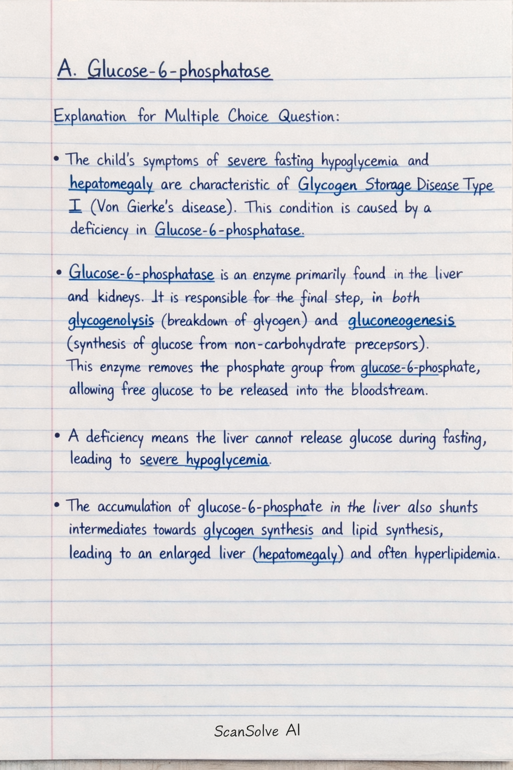 - PFK-1 (Phosphofructokinase-1) and Pyruvate kinase are enzymes in glycolysis. Deficiencies typically cause hemolytic anemia (especially pyruvate kinase) or muscle weakness, not this specific combination of severe fasting hypoglycemia and hepatomegaly.