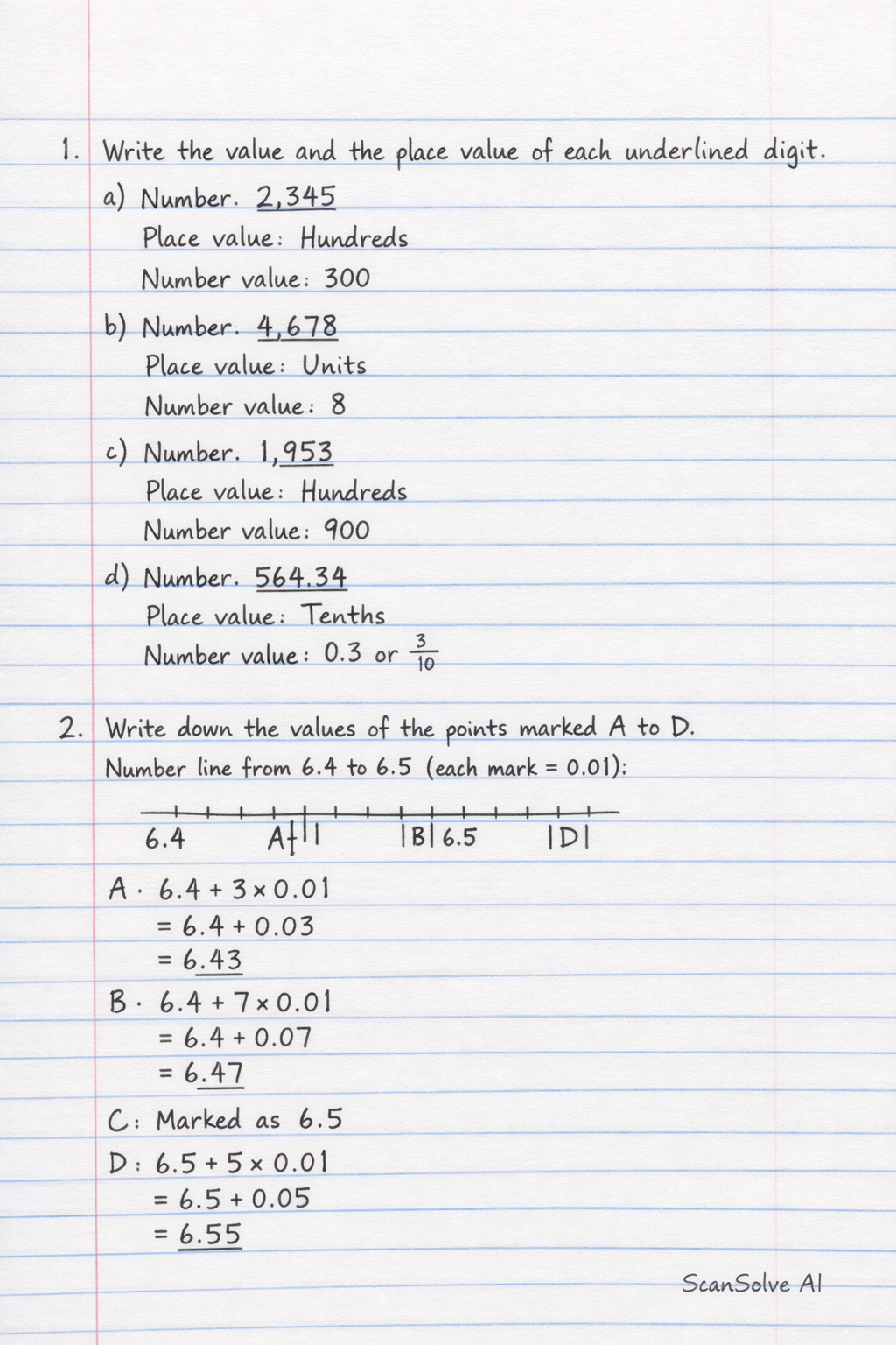 - Write down the values of the points marked A to D using decimal fractions.