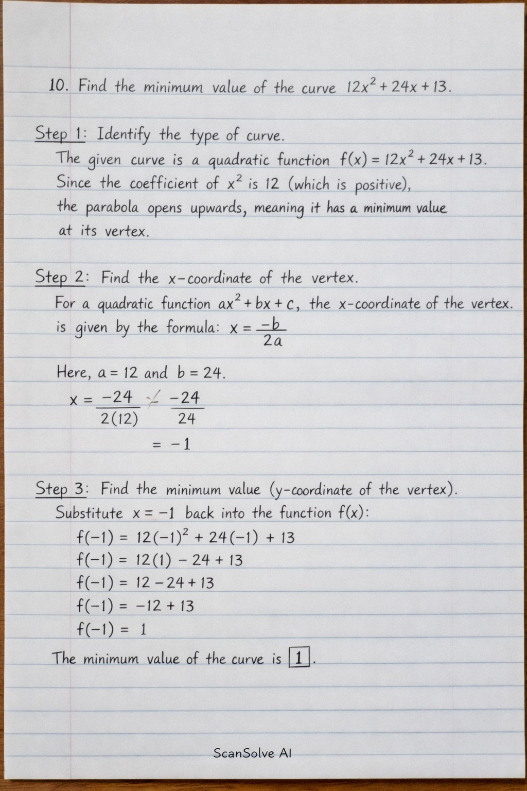 The given curve is a quadratic function f(x)=12x2+24x+13. Since the coefficient of x2 is 12 (which is positive), the parabola opens upwards, meaning it has a minimum value at its vertex.