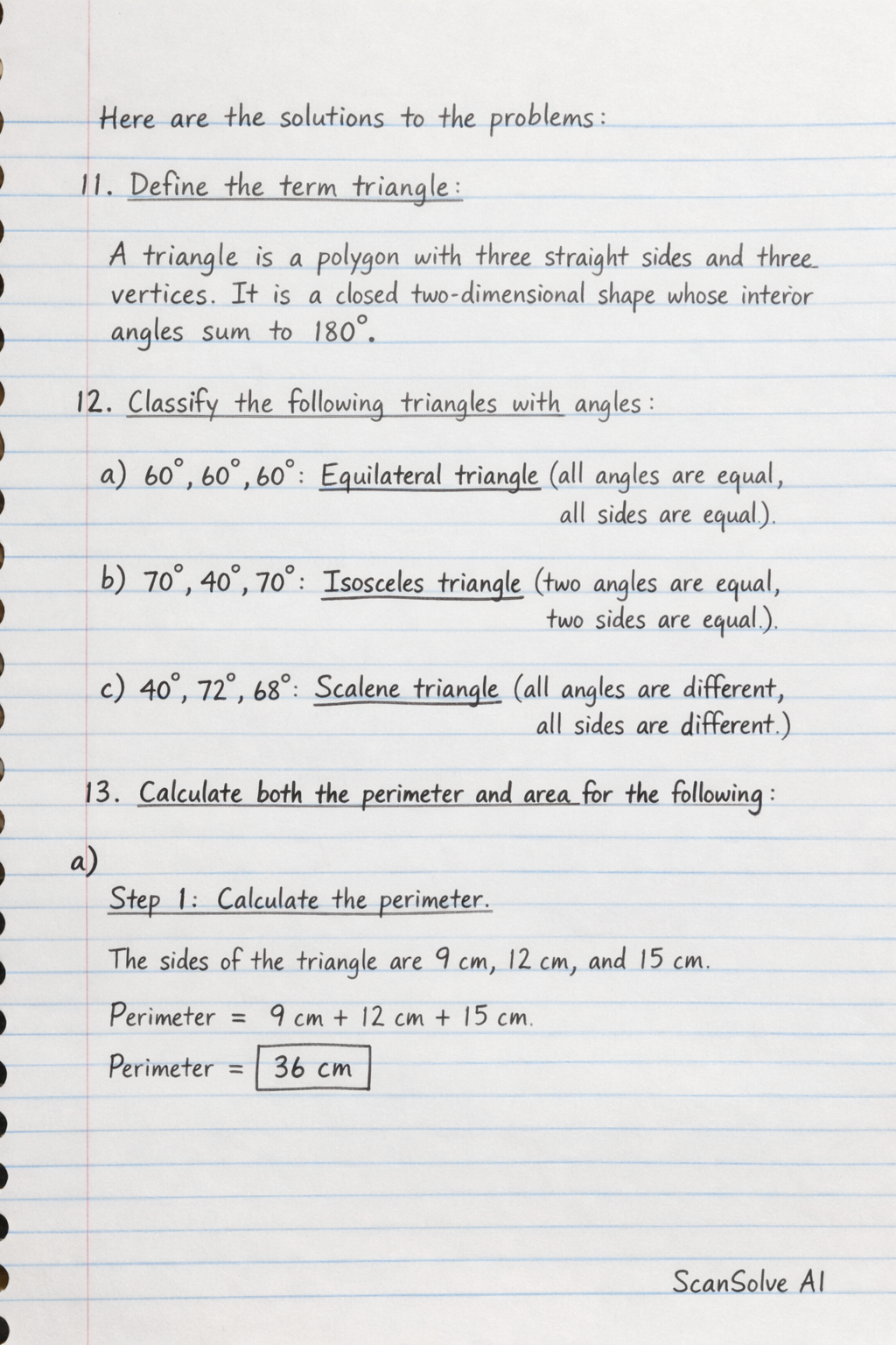 A triangle is a polygon with three straight sides and three vertices. It is a closed two-dimensional shape whose interior angles sum to 180∘.