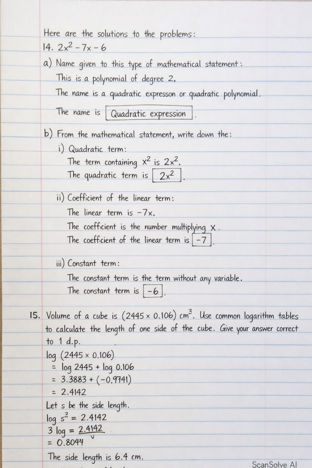 15. Volume of a cube is given as (2445×0.106)cm3. Use common logarithm tables to calculate the length of one side of the cube. Give your answer correct to 1 d.p.