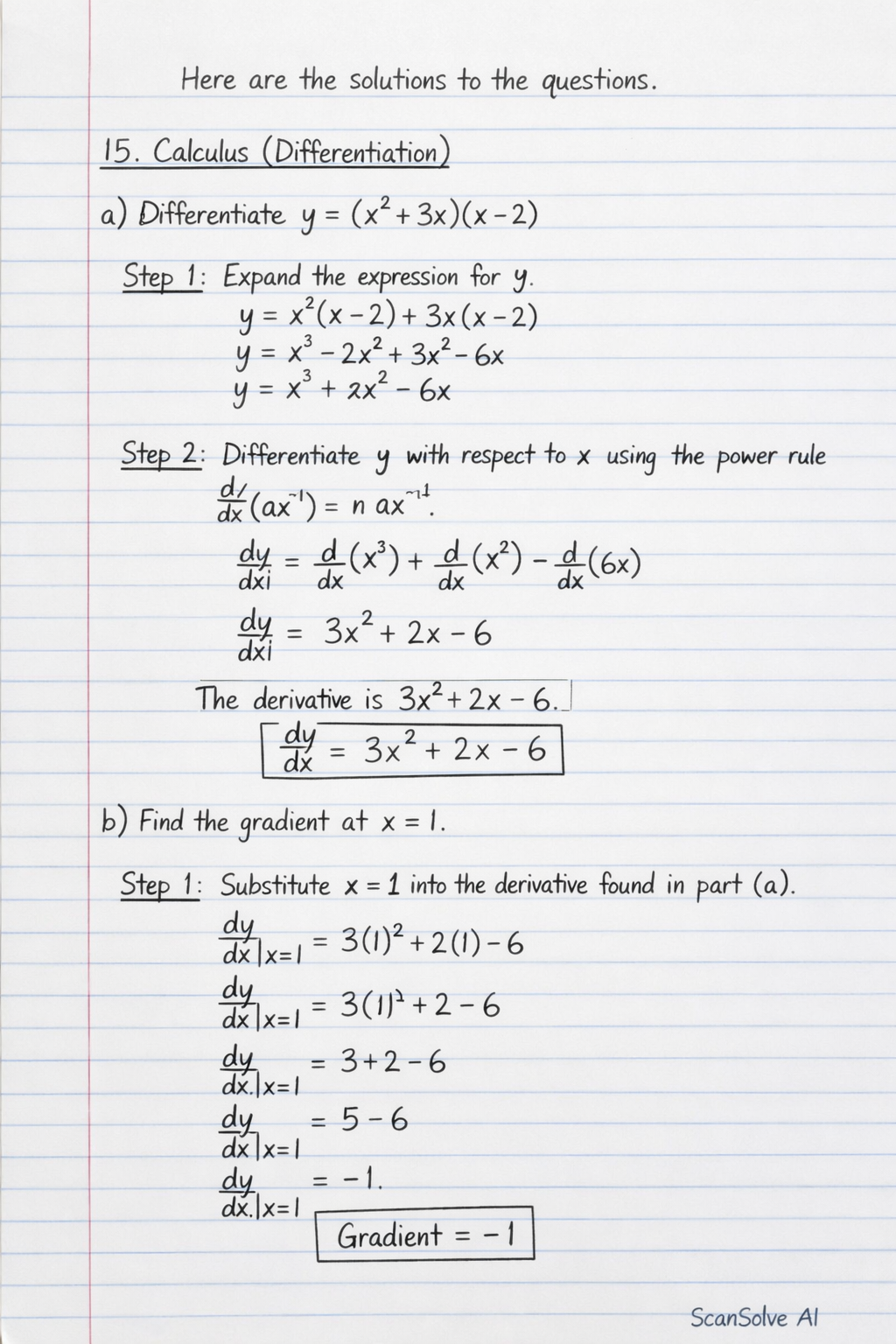 a) Differentiate $y = (x^2 + 3x)(x - 2)$