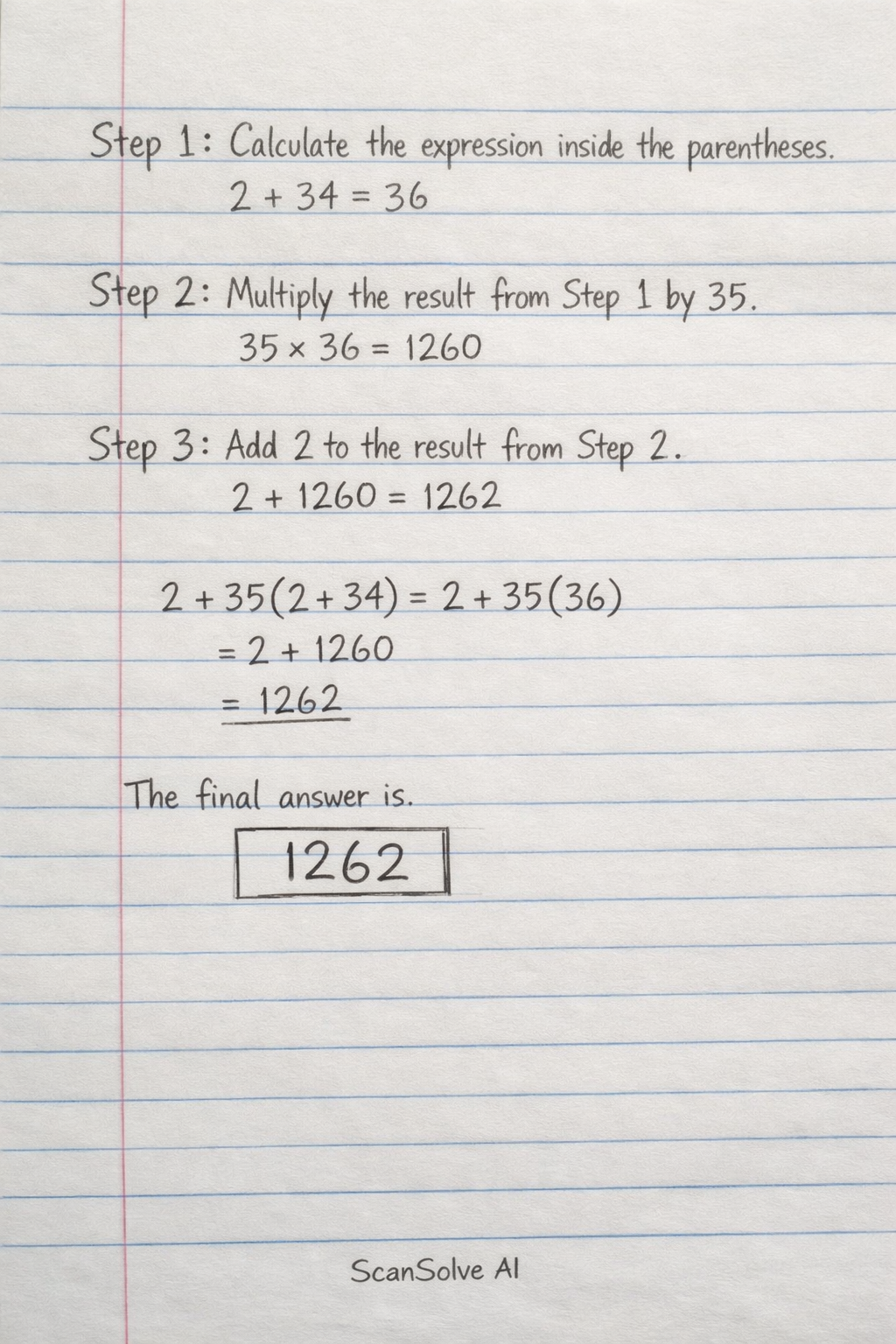 $$2 + 35(2 + 34) = 2 + 35(36) = 2 + 1260 = 1262$$