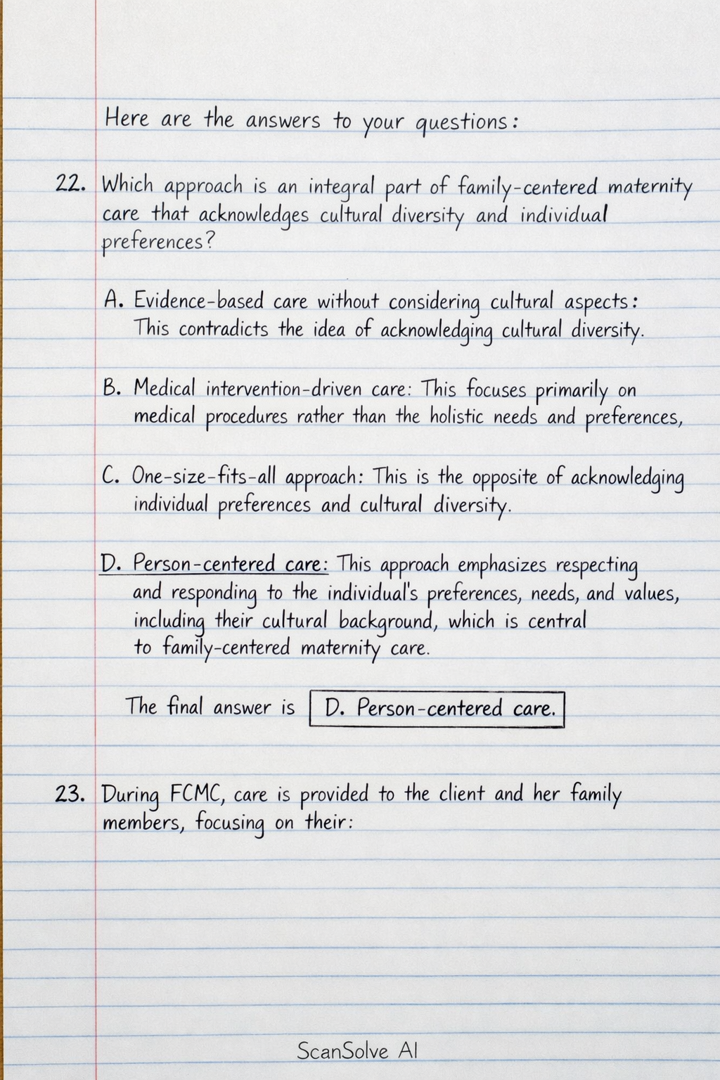 22. Which approach is an integral part of family-centered maternity care that acknowledges cultural diversity and individual preferences?