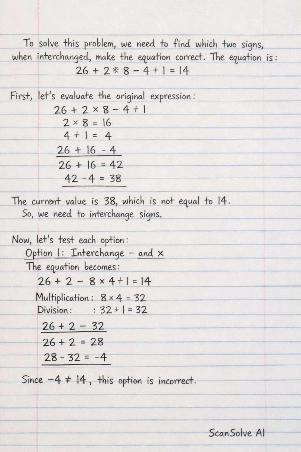 The current value of the left side is 38, which is not equal to 14. So, we need to interchange signs.