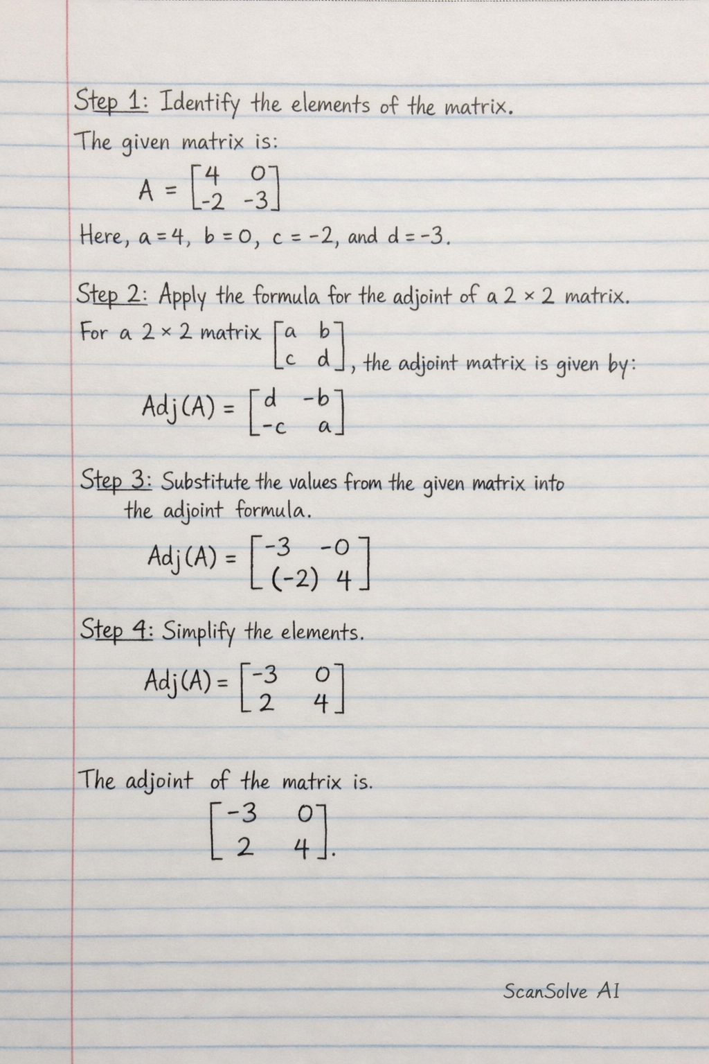 Step 2: Apply the formula for the adjoint of a 2×2 matrix.