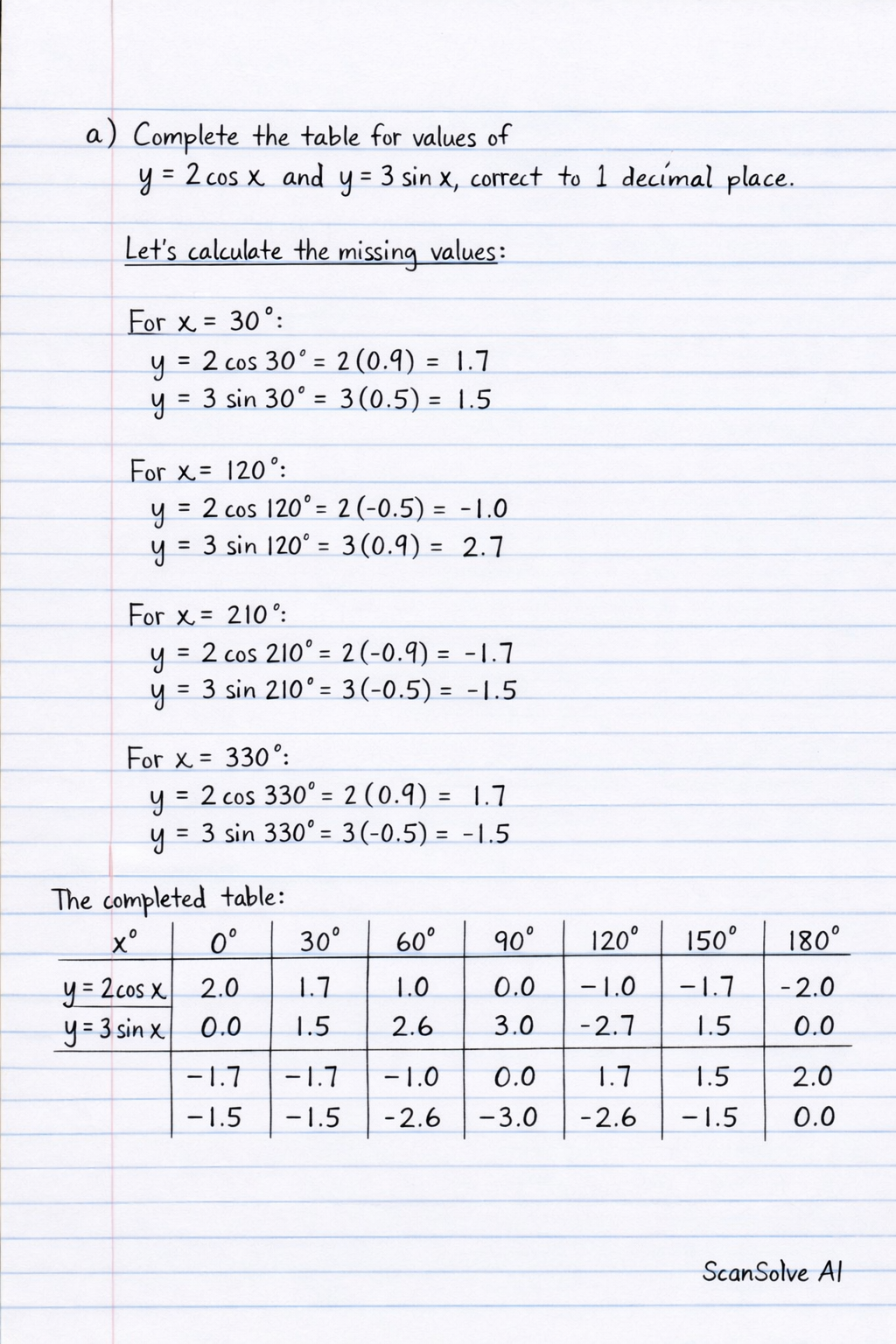 a) Complete the table for values of and , correct to 1 decimal place.