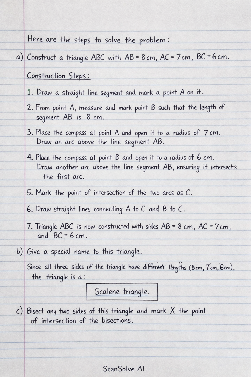 a) Construct a triangle ABC with AB = 8cm, AC = 7cm, BC = 6cm. Construction Steps: 1.