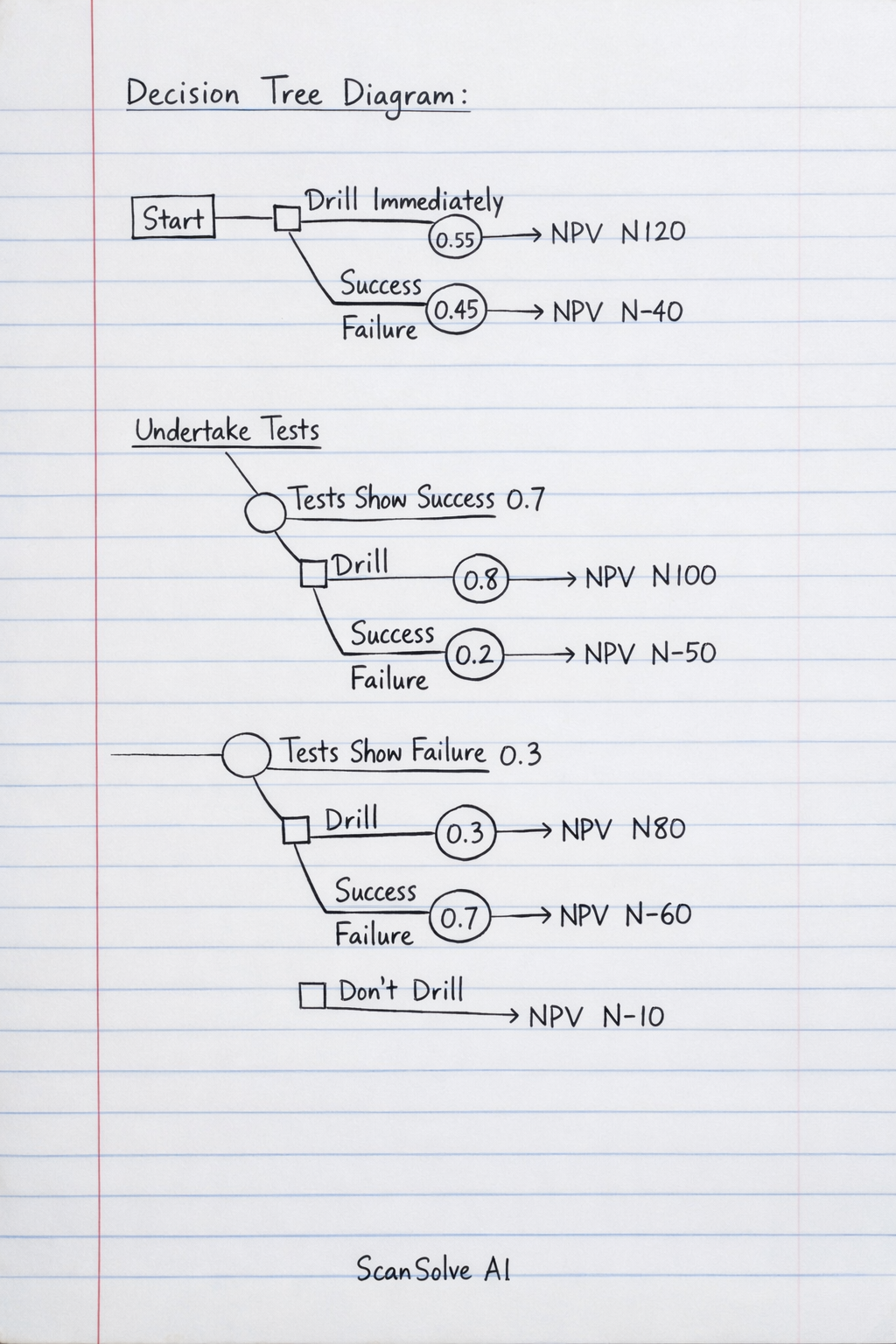 Start(DecisionNode)1.DrillImmediately(NoTests)ChanceNode(DrillingOutcome)Success(P=0.55)Failure(P=0.45)2.UndertakeTestsChanceNode(TestResults)TestsShowSuccess(P=0.7)DecisionNodea)DrillChanceNode(DrillingOutcome)Success(P=0.8)Failure(P=0.2)b)SellExploitationRightsTestsShowFailure(P=0.3)DecisionNodea)DrillChanceNode(DrillingOutcome)Success(P=0.2)Failure(P=0.8)b)SellExploitationRights3.SellExploitationRightsImmediately(NoTests)→NPVN120→NPVN−40→NPVN100→NPVN−50→NPVN65→NPVN100→NPVN−50→NPVN15→NPVN45