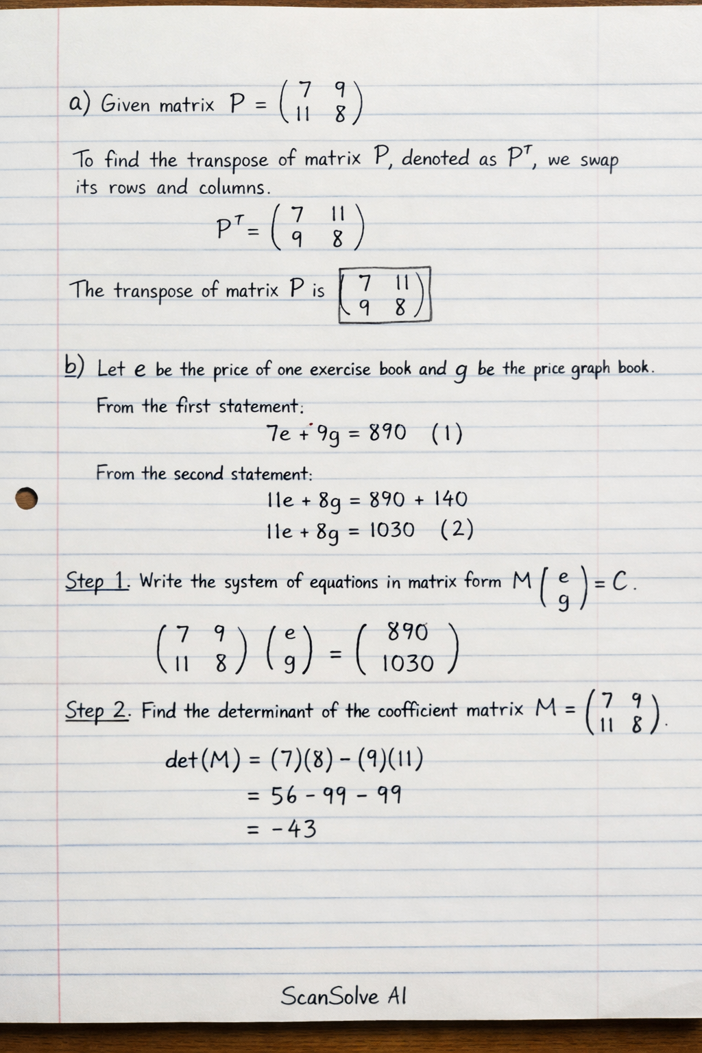 Step 4: Multiply by the constant matrix to find . The price of one exercise book is Kshs. 50 and the price of one graph book is Kshs. 60.