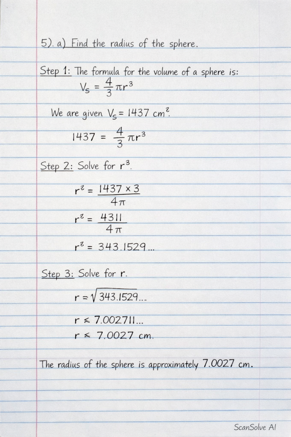 a) Find the radius of the sphere. Step 1: The formula for the volume of a sphere is . We are given . Step 2: Solve for .