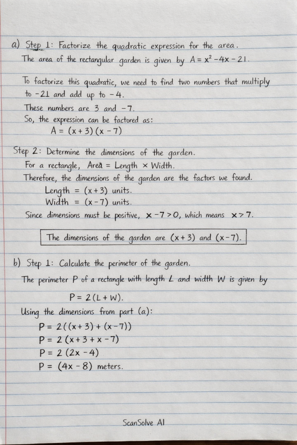 a) Step 1: Factorize the quadratic expression for the area. The area of the rectangular garden is given by A = x^2 - 4x - 21.