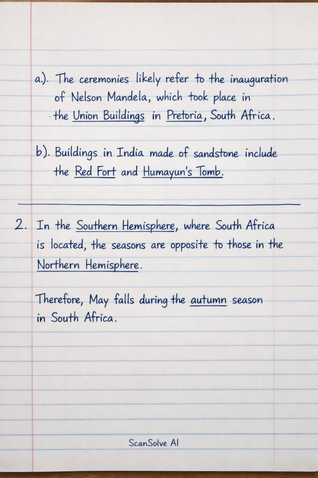 a) The ceremonies likely refer to the inauguration of Nelson Mandela, which took place in the Union Buildings in Pretoria, South Africa. b) Buildings in India made of sandstone include the Red Fort and Humayun's Tomb.