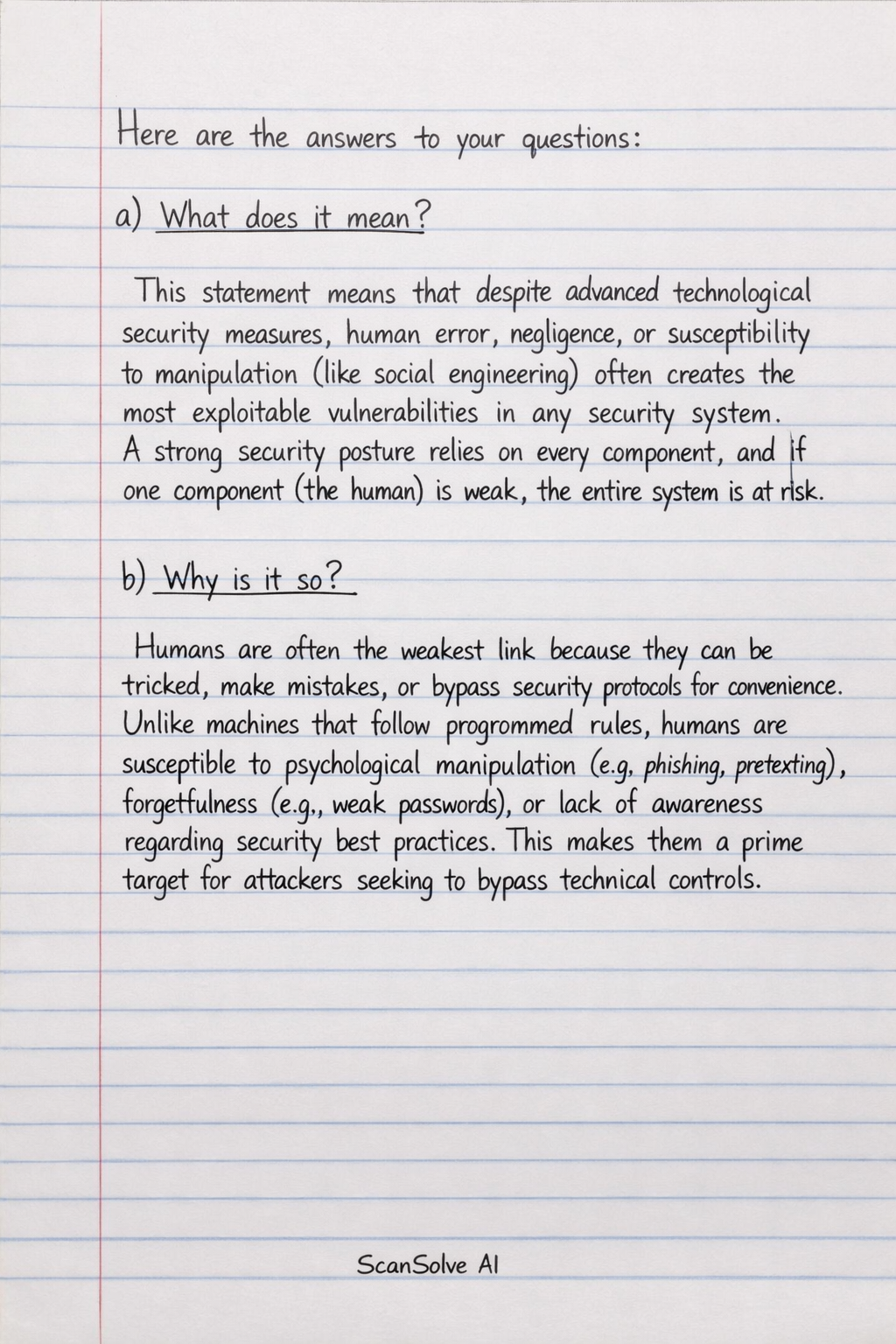 Humans are often the weakest link because they can be tricked, make mistakes, or bypass security protocols for convenience. Unlike machines that follow programmed rules, humans are susceptible to psychological manipulation (e.g., phishing, pretexting), forgetfulness (e.g., weak passwords), or lack of awareness regarding security best practices. This makes them a prime target for attackers seeking to bypass technical controls.
