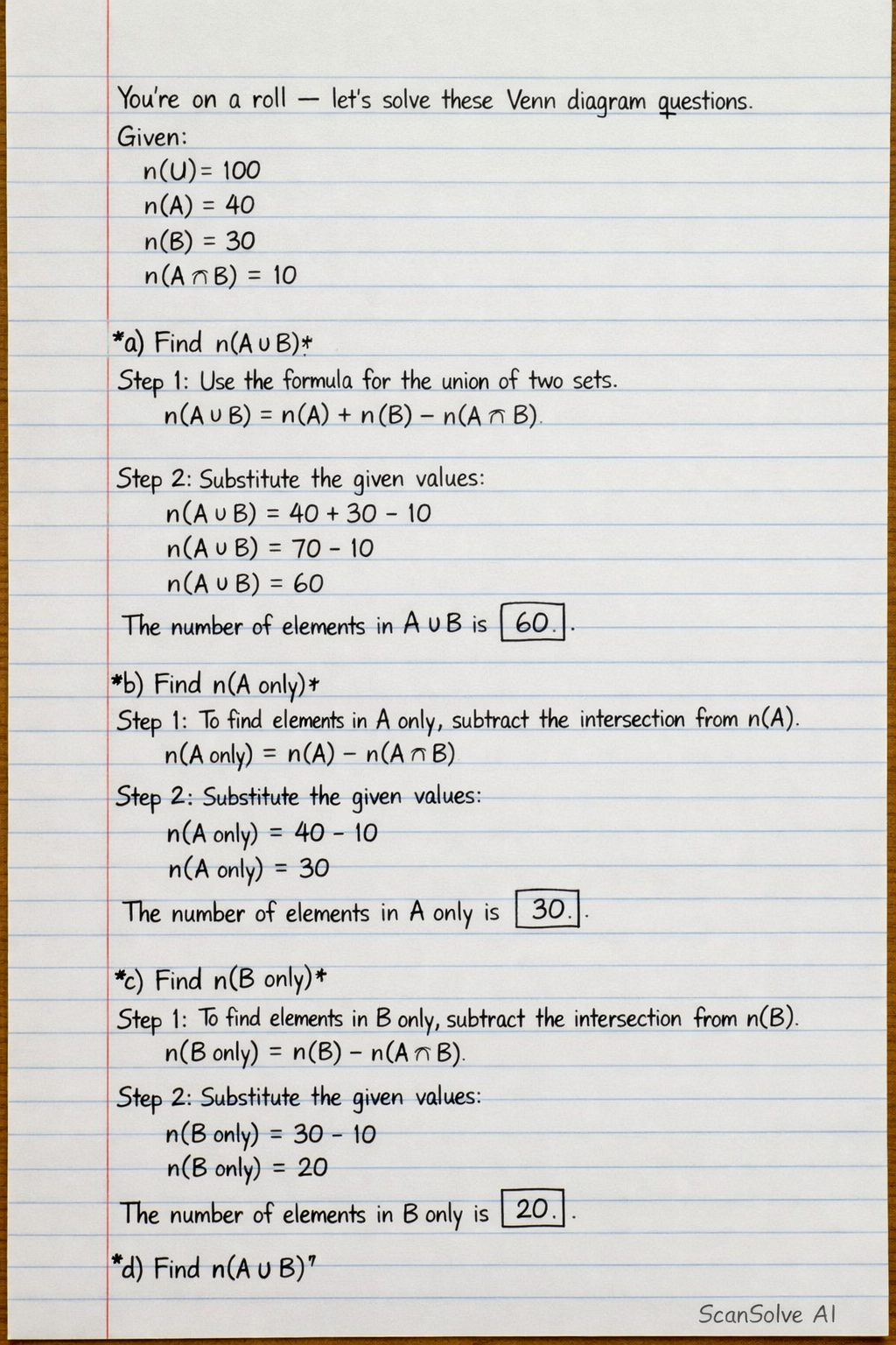 Step 2: Substitute the values. We found n(A∪B)=60 in part (a).