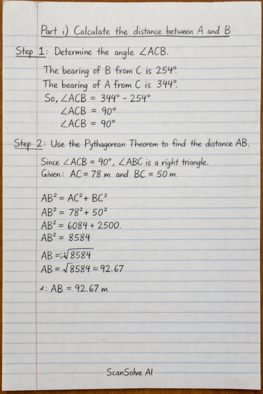 Step 2: Use the Pythagorean Theorem to find the distance AB.