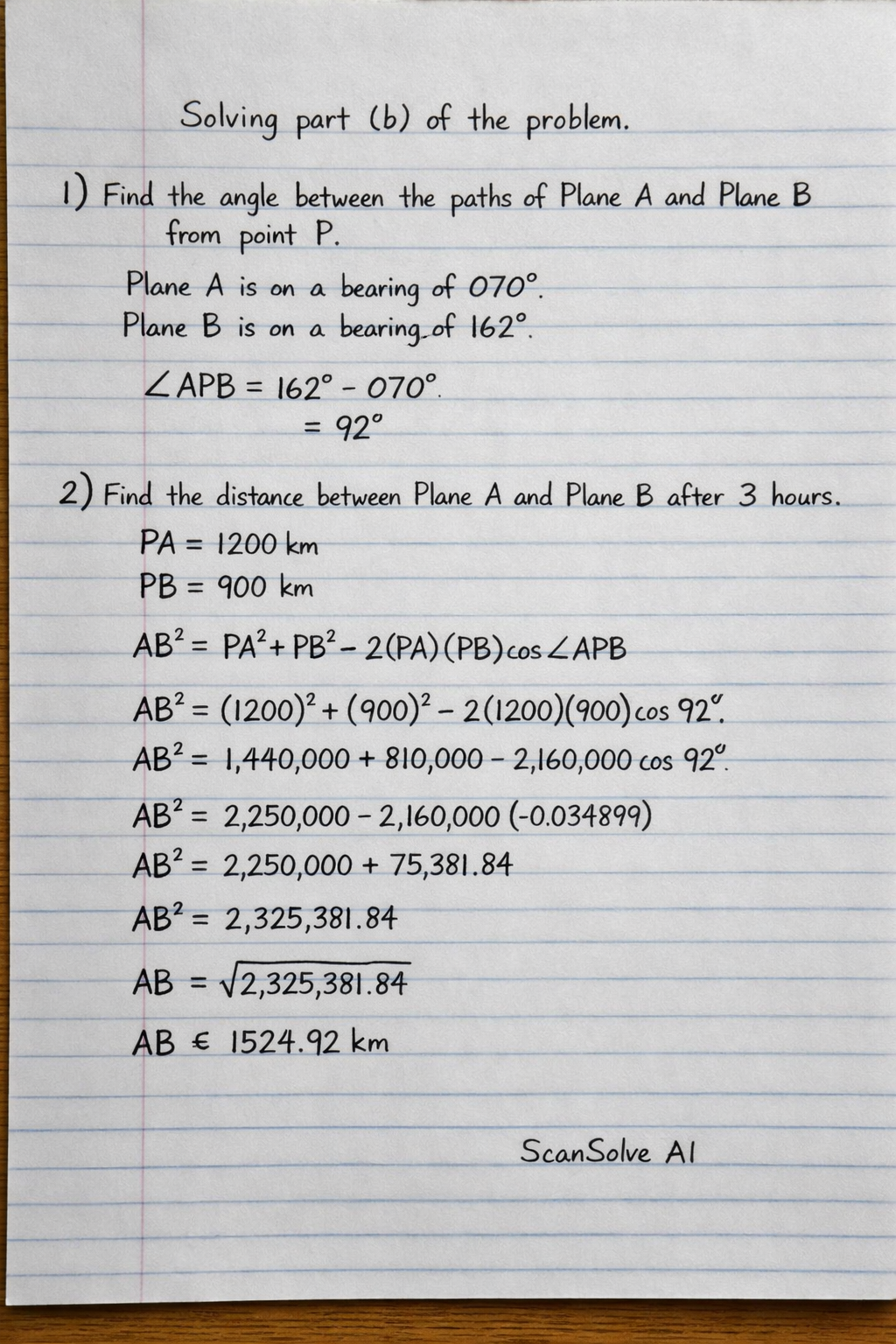 AB2=PA2+PB2−2(PA)(PB)cos(∠APB)AB2=(1200)2+(900)2−2(1200)(900)cos(92∘)AB2=1,440,000+810,000−2,160,000cos(92∘)AB2=2,250,000−2,160,000(−0.034899)AB2=2,250,000+75,381.84AB2=2,325,381.84AB=2,325,381.84AB≈1524.92km