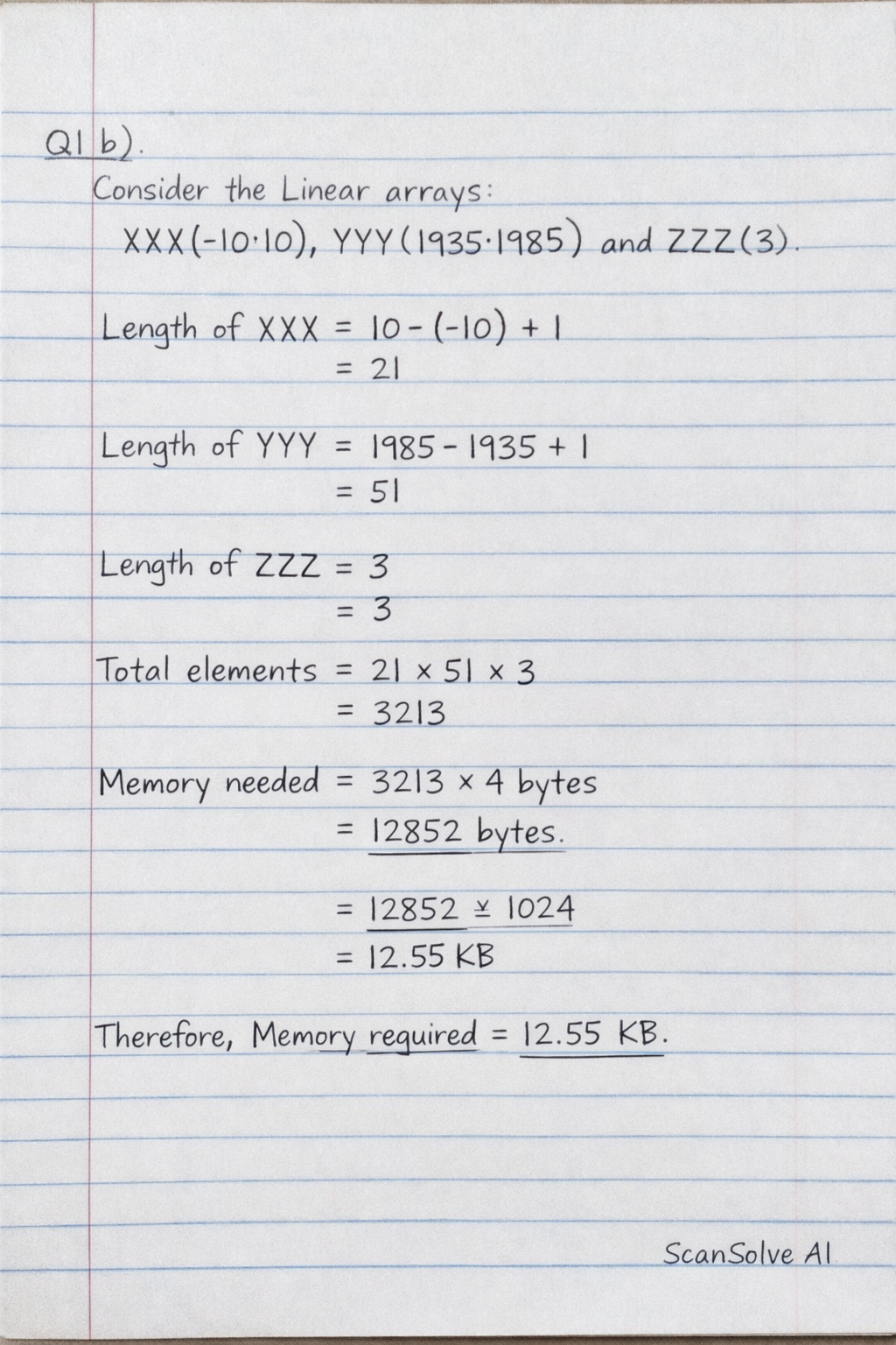 **Q1 b) Consider the Linear array XXX(-10:10), YYY(1935:1985) and ZZZ(3