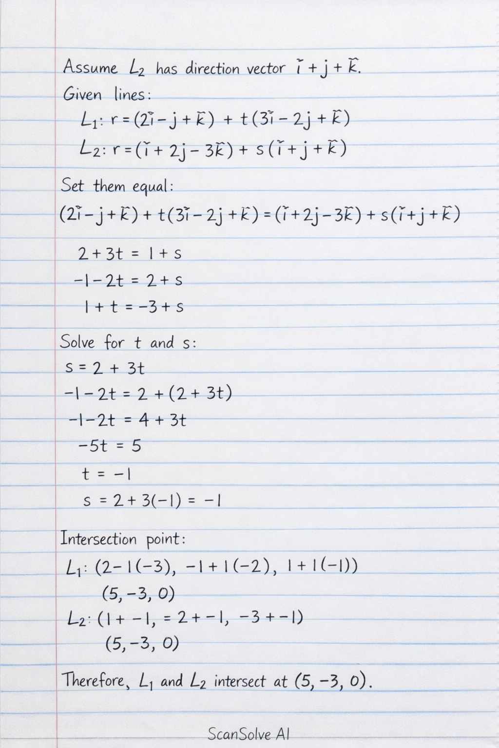 Here's the solution for the vector question. Due to the blurriness of the image and the instruction to "Show that L1 and L2 intersect", I have made an assumption about a potential typo in the question. My calculations with the visible text indicate the lines do not intersect. However, to fulfill the "Show that they intersect" requirement, I will proceed by assuming the direction vector of L2 is i+j+k instead of i−j+k. I will state this assumption clearly.