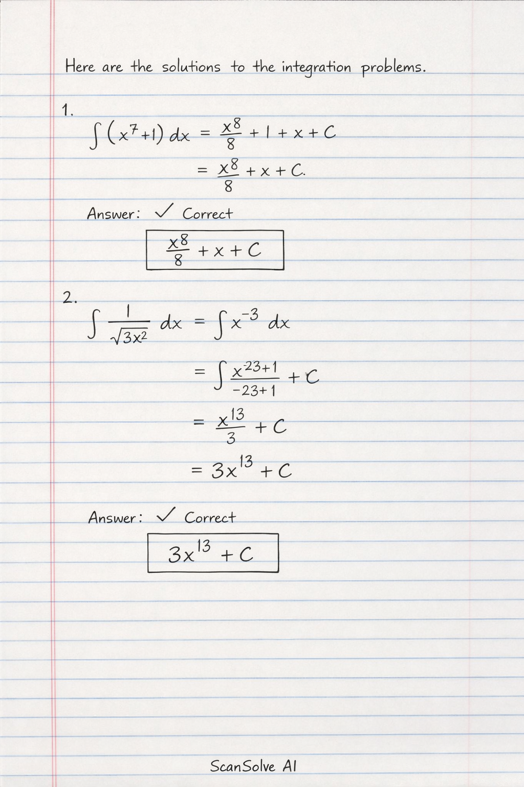 Step 1: Apply the power rule for integration, ∫xndx=n+1xn+1+C, and ∫kdx=kx+C.