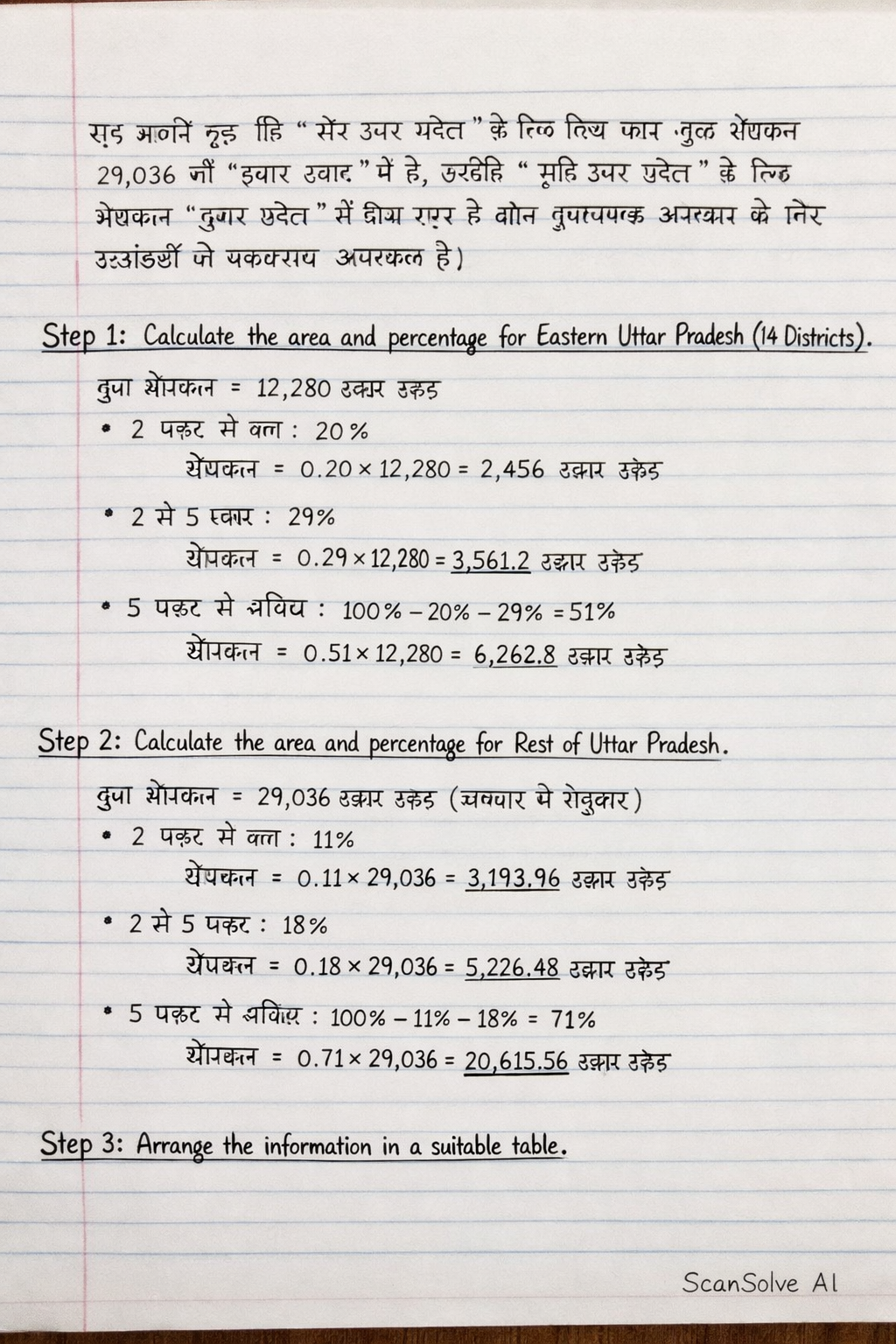 यह मानते हुए कि 'शेष उत्तर प्रदेश' के लिए दिया गया कुल क्षेत्रफल 29,036 भी 'हजार एकड़' में है, क्योंकि 'पूर्वी उत्तर प्रदेश' के लिए क्षेत्रफल 'हजार एकड़' में दिया गया है और तुलनात्मक अध्ययन के लिए इकाइयों में एकरूपता आवश्यक है।