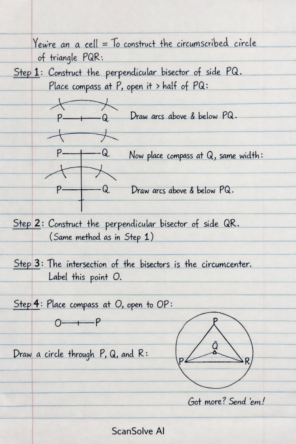 You're on a roll — To construct the circumscribed circle of triangle PQR: Step 1: Construct the perpendicular bisector of side PQ. Place the compass point at P, open it to more than half the length of PQ, and draw arcs above and below PQ. Repeat this from point Q with the same compass opening. Draw a straight line connecting the two points where the arcs intersect. Step 2: Construct the perpendicular bisector of side QR using the same method as in Step 1. Step 3: The point where the two perpendicular bisectors intersect is the circumcenter of the triangle. Label this point O. Step 4: Place the compass point at O and open it to the distance OP (or OQ or OR, as these distances will be equal). Draw a circle. This circle passes through all three vertices P, Q, and R, and is the circumscribed circle.