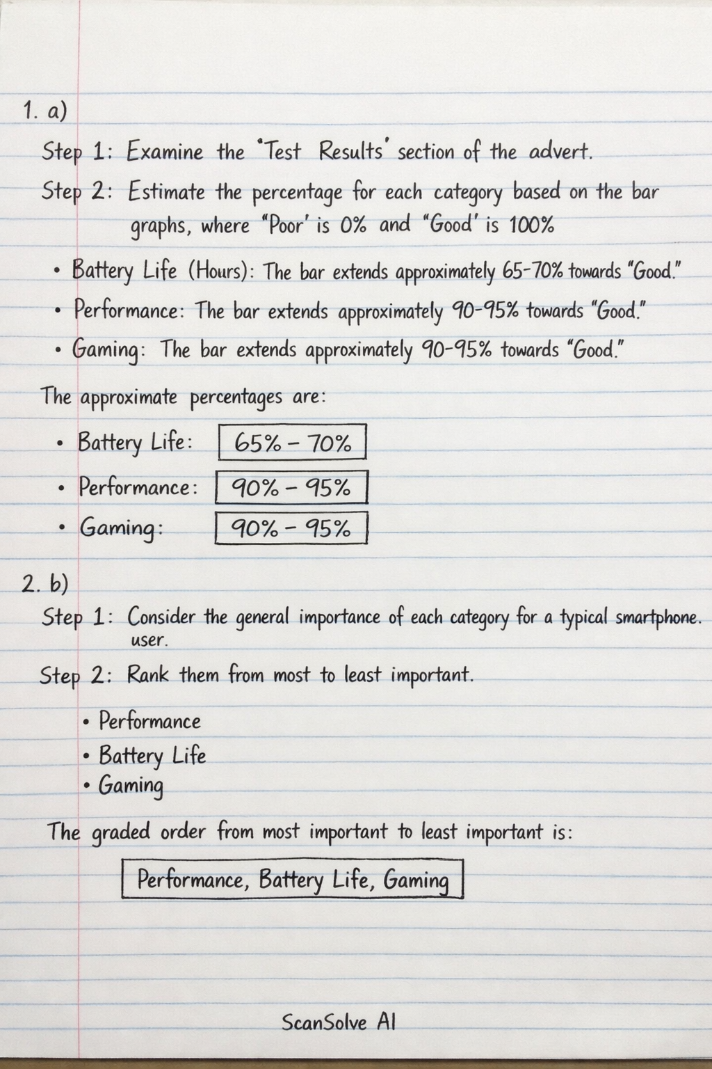 a) Step 1: Examine the "Test Results" section of the advert. Step 2: Estimate the percentage for each category based on the bar graphs, where "Poor" is 0% and "Good" is 100%. • Battery Life (Hours): The bar extends approximately 65-70% towards "Good". • Performance: The bar extends approximately 90-95% towards "Good". • Gaming: The bar extends approximately 90-95% towards "Good".