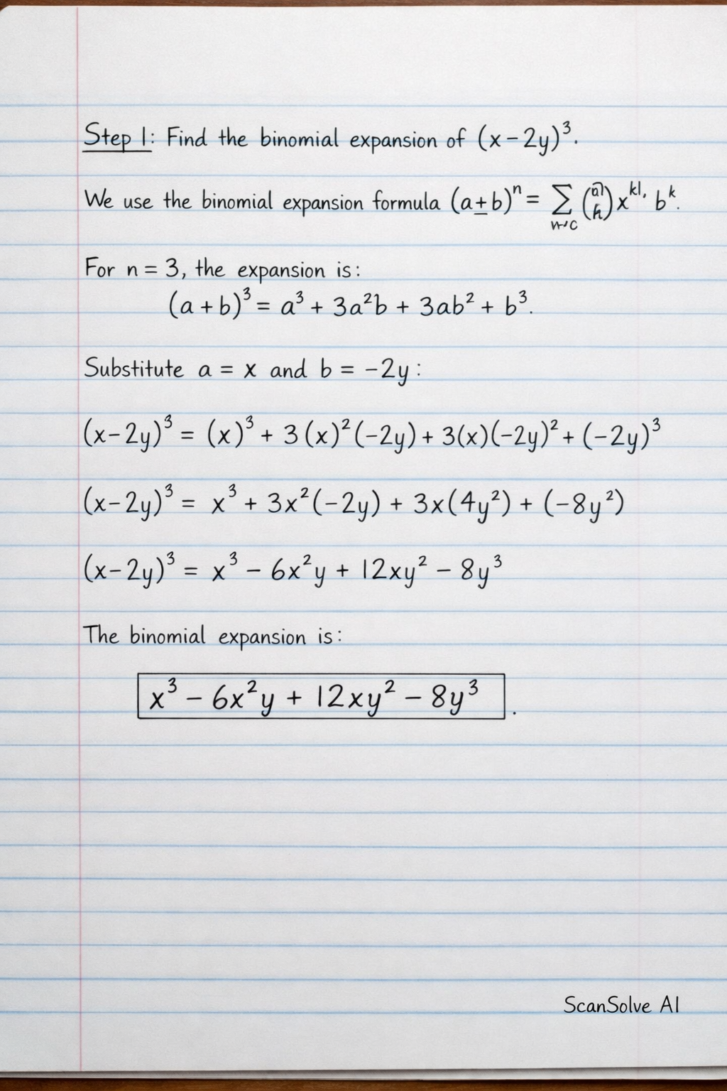 Step 1: Find the binomial expansion of (x−2y)3.