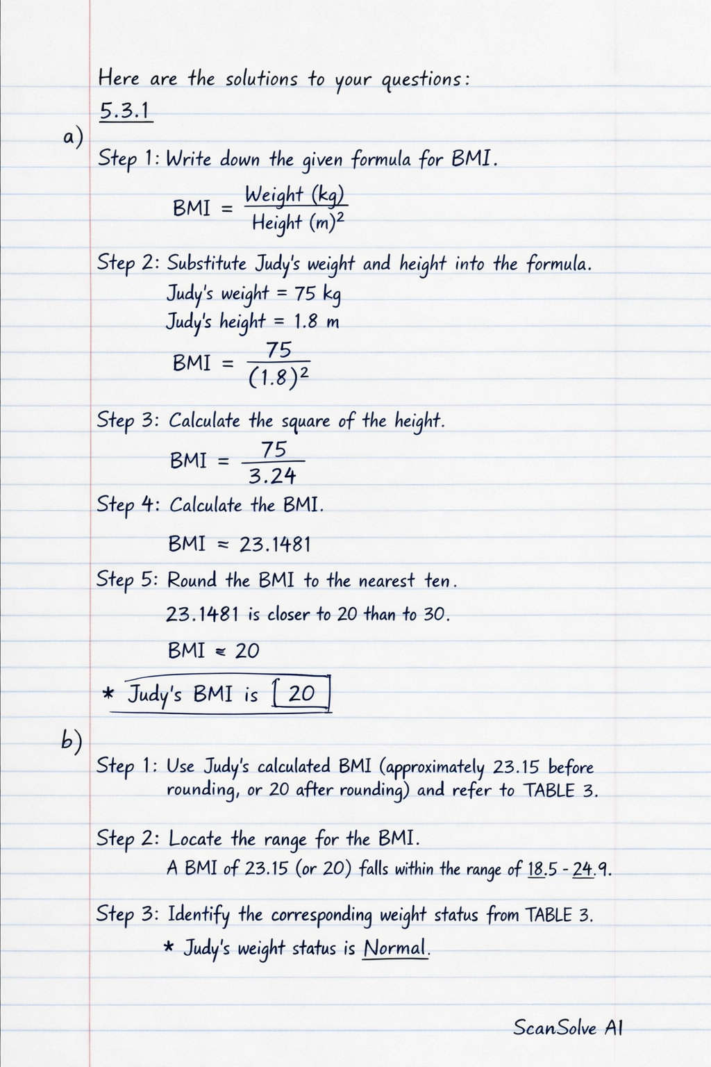 Step 1: Use Judy's calculated BMI (approximately 23.15 before rounding to the nearest ten, or 20 after rounding) and refer to TABLE 3.