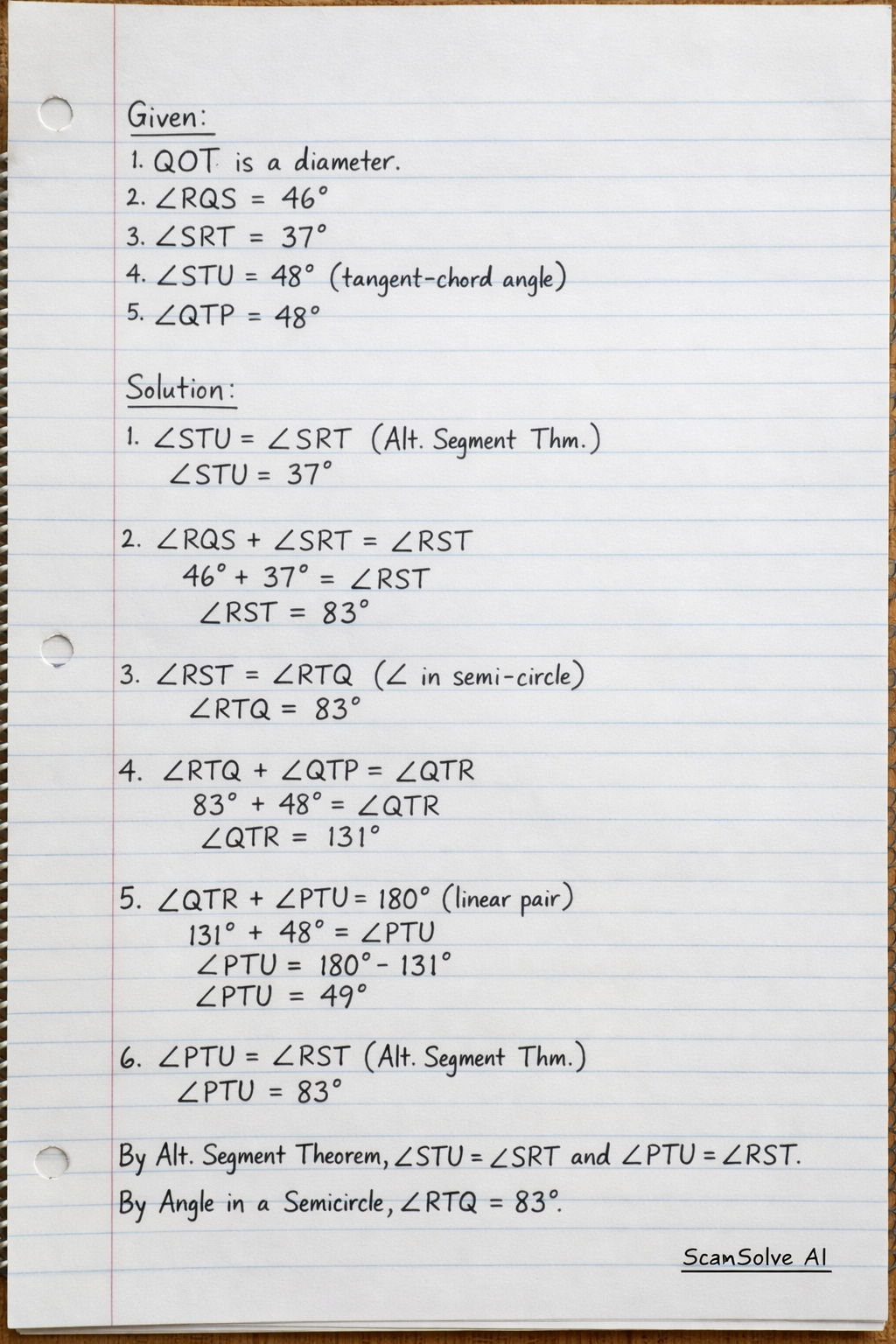 $\angle STU = 48^\circ$ (angle between tangent TU and chord ST).