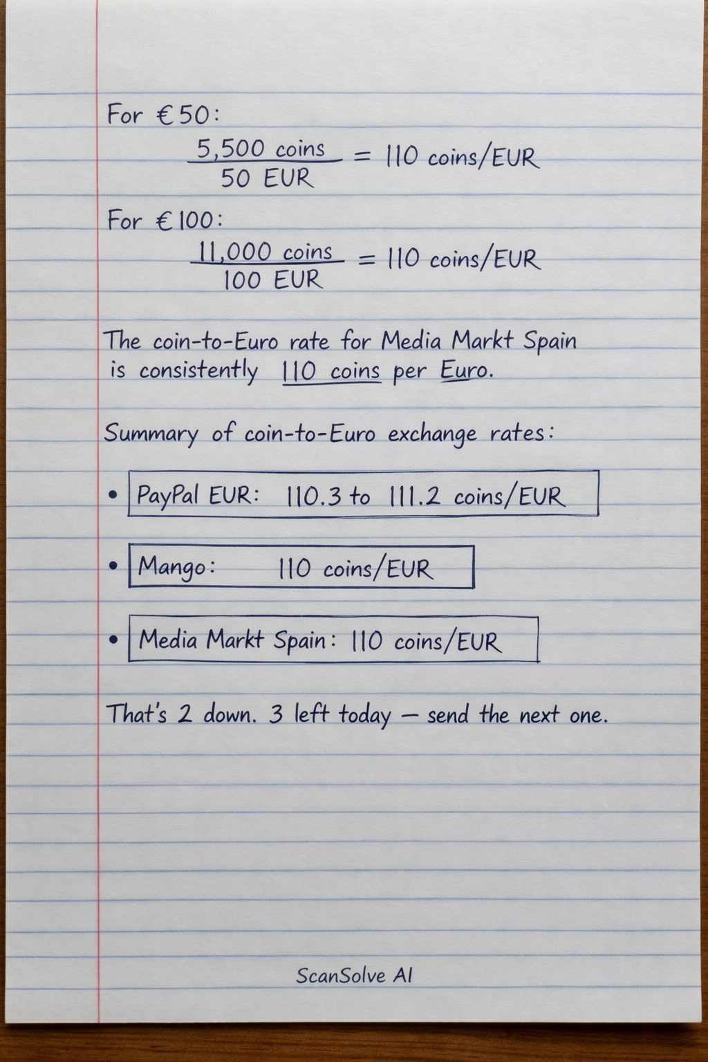 The coin-to-Euro rate for Media Markt Spain is consistently 110 coins per Euro.