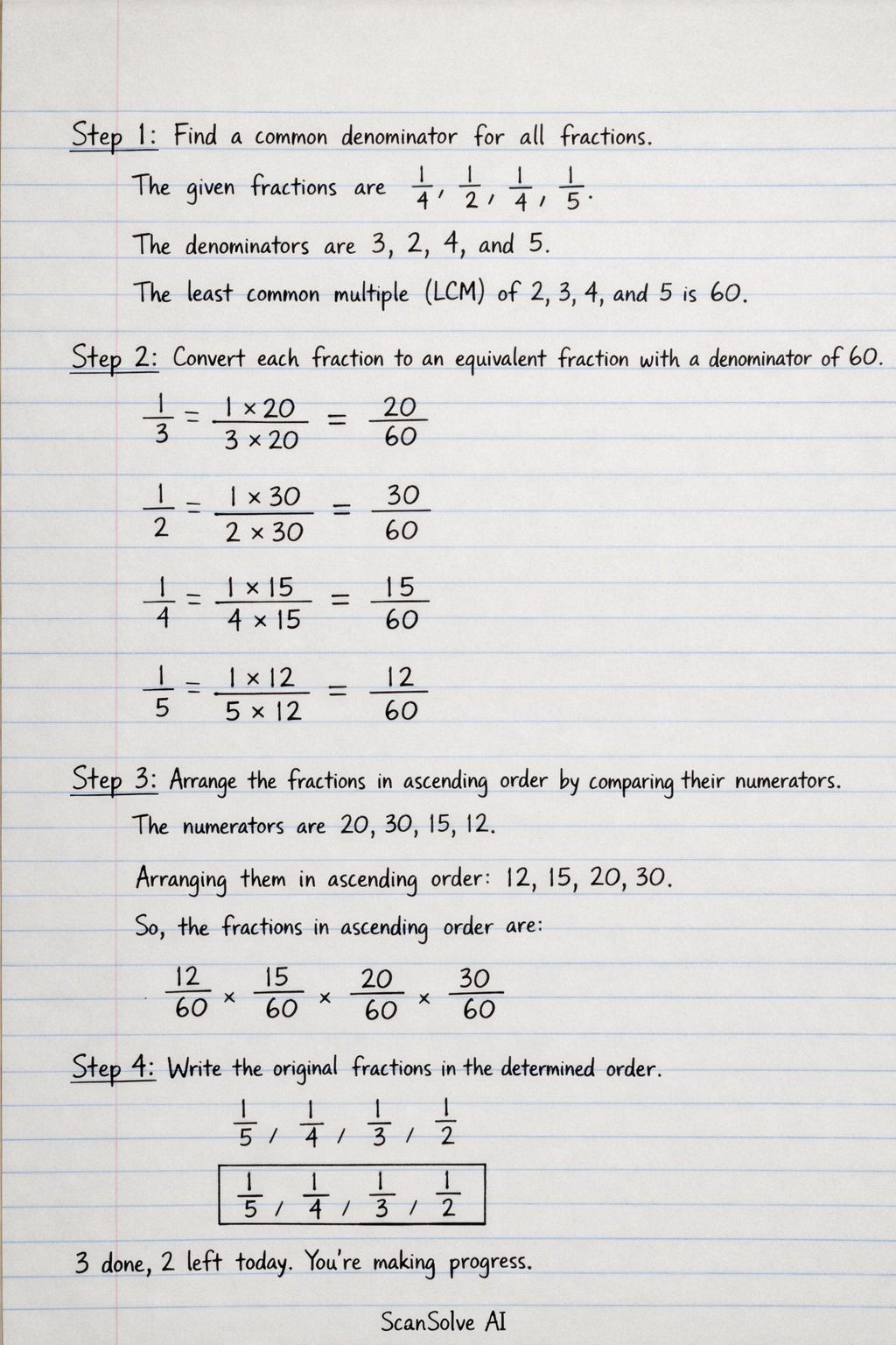 Step 3: Arrange the fractions in ascending order by comparing their numerators.