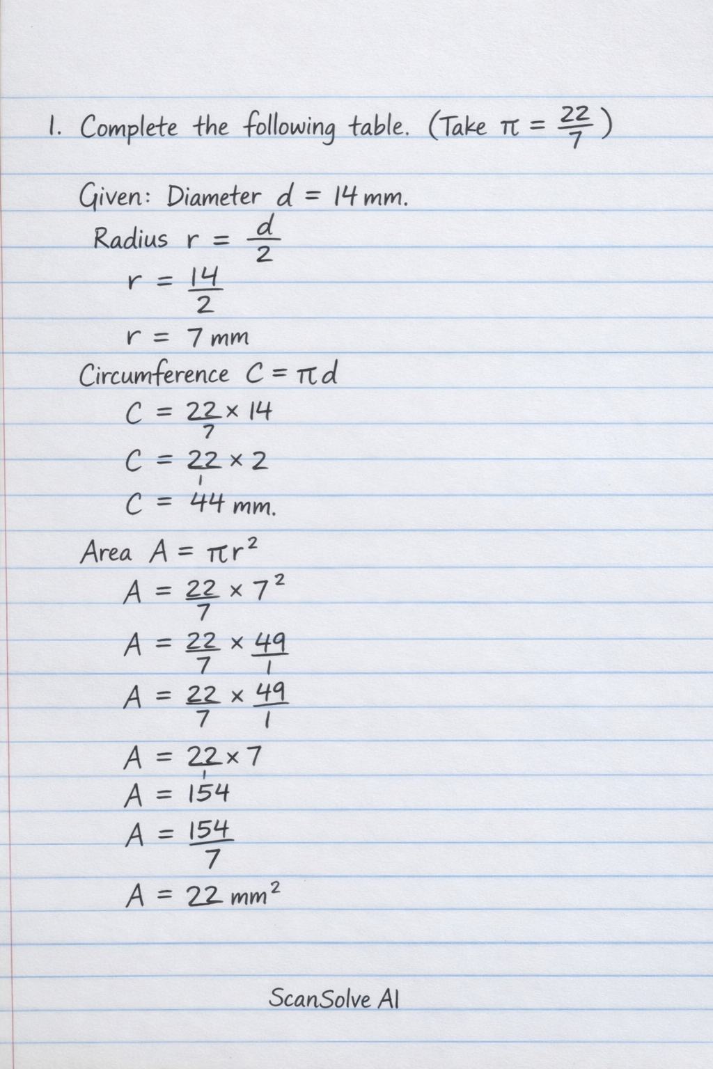 Here are the solutions to the problems: 1. Complete the following table. (Take = (22)/(7)) Row 1: Given: Diameter d = 14 mm Radius r = (d)/(2) = 14 mm2 = 7 mm Circumference C = d = (22)/(7) × 14 mm = 44 mm Area $A = r^2 = (22)/(7) × (7 \