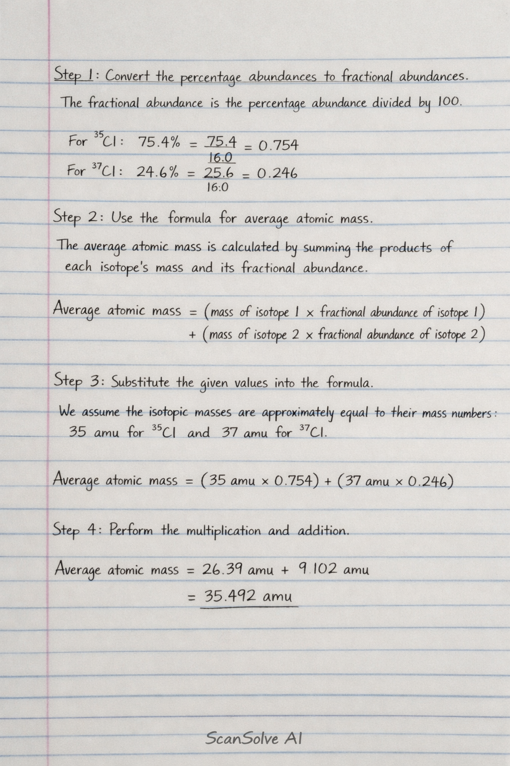 Average atomic mass=(35amu×0.754)+(37amu×0.246)